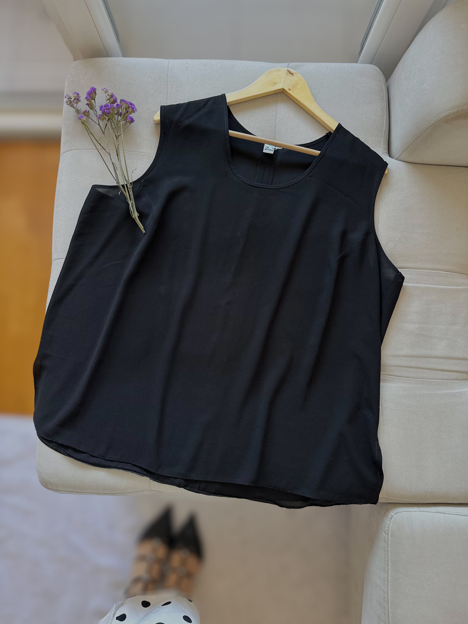 Црн безвременски топ без ракави, со кружно деколте и едноставен крој