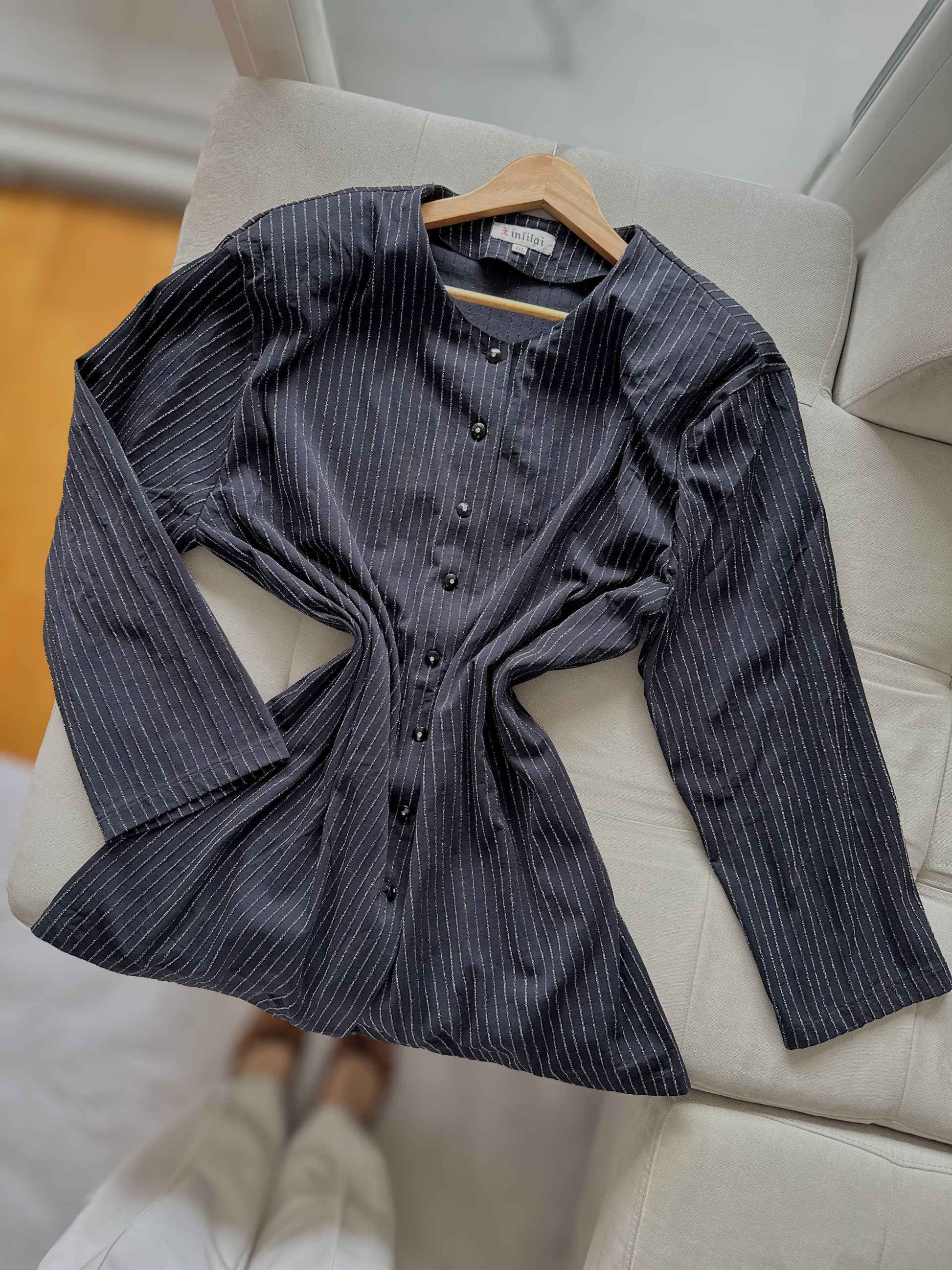 Темна блуза со тенки, бели, светкави, вертикални линии. Има кружно деколте, долги ракави и закопчување со црни копчиња по целата должина. Класичен и елегантен модел.