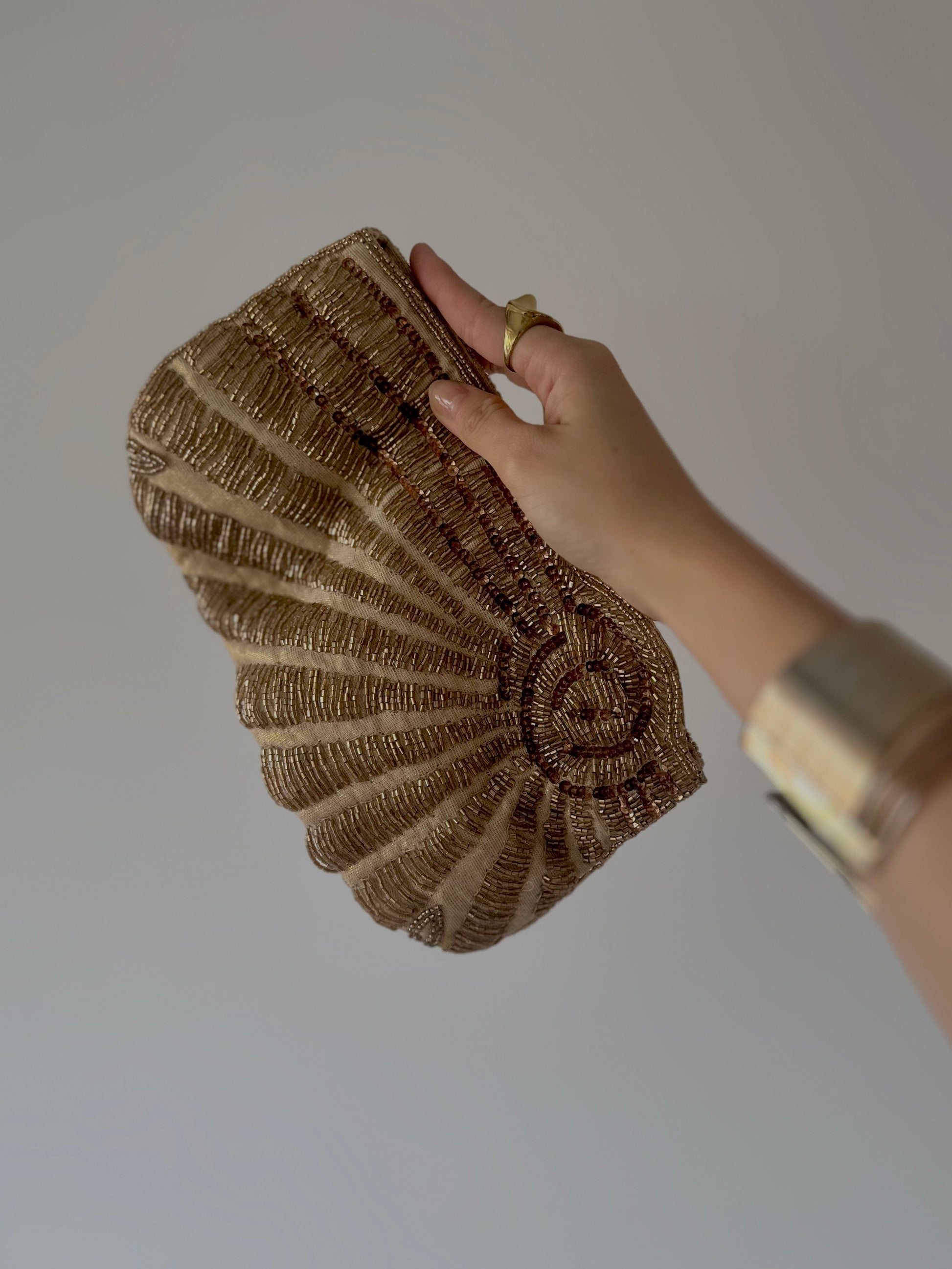 Елегантна рачна чанта во форма на школка, украсена со златни монистри (од предната страна), задната страна е од златен материјал.