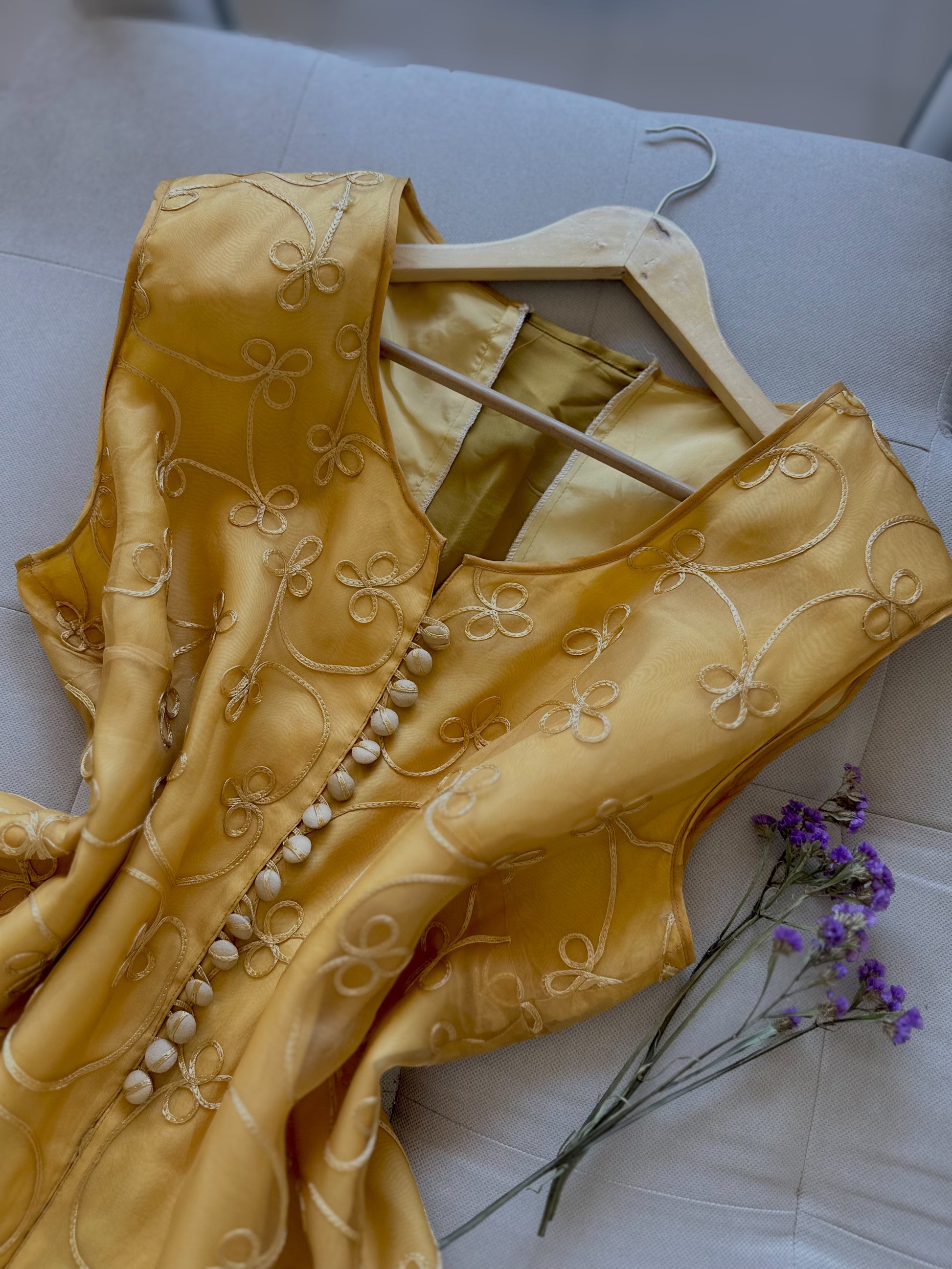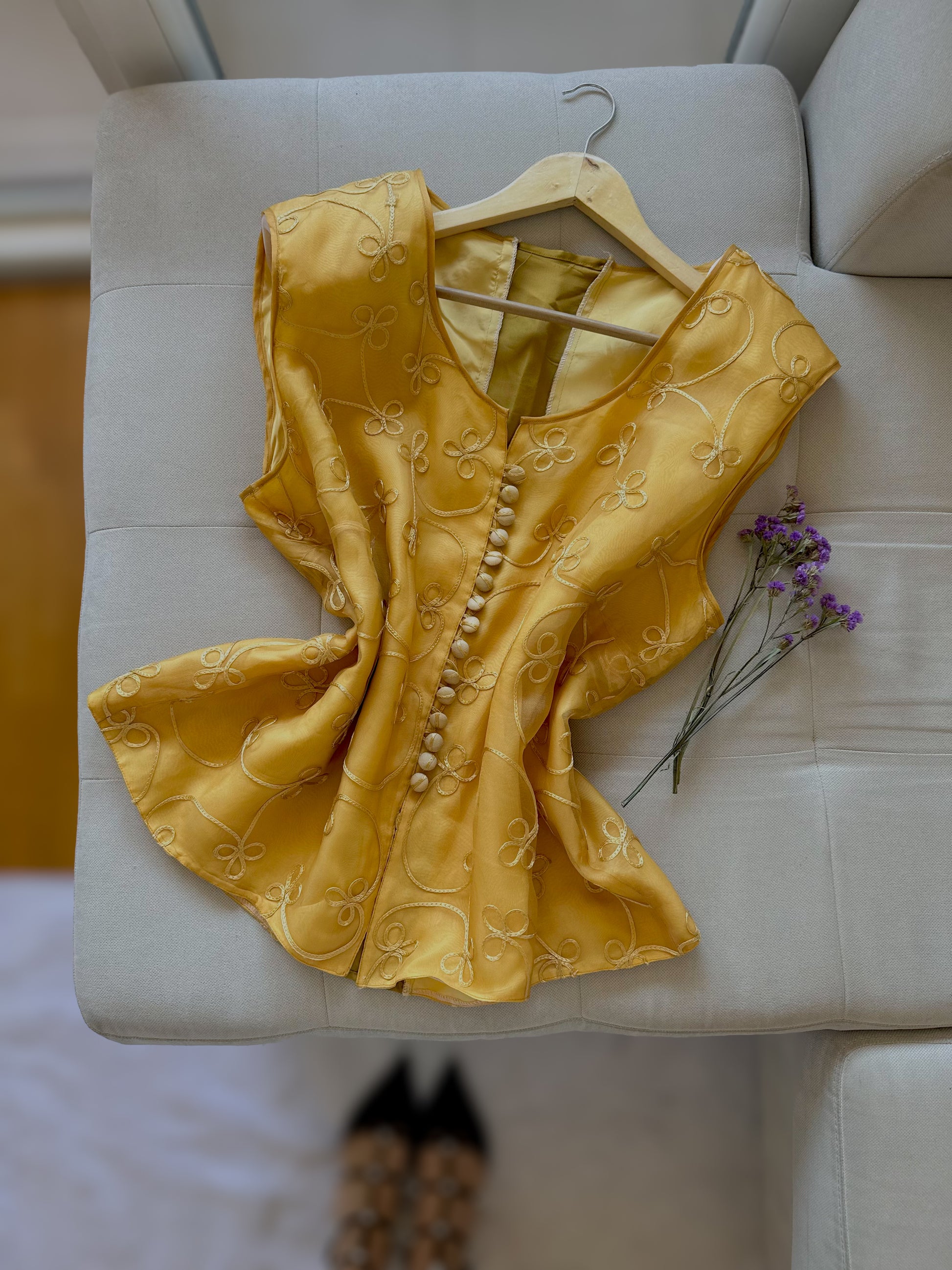 Жолта елегантена блуза со извезен флорален дезен и декоративни копчиња по должината.