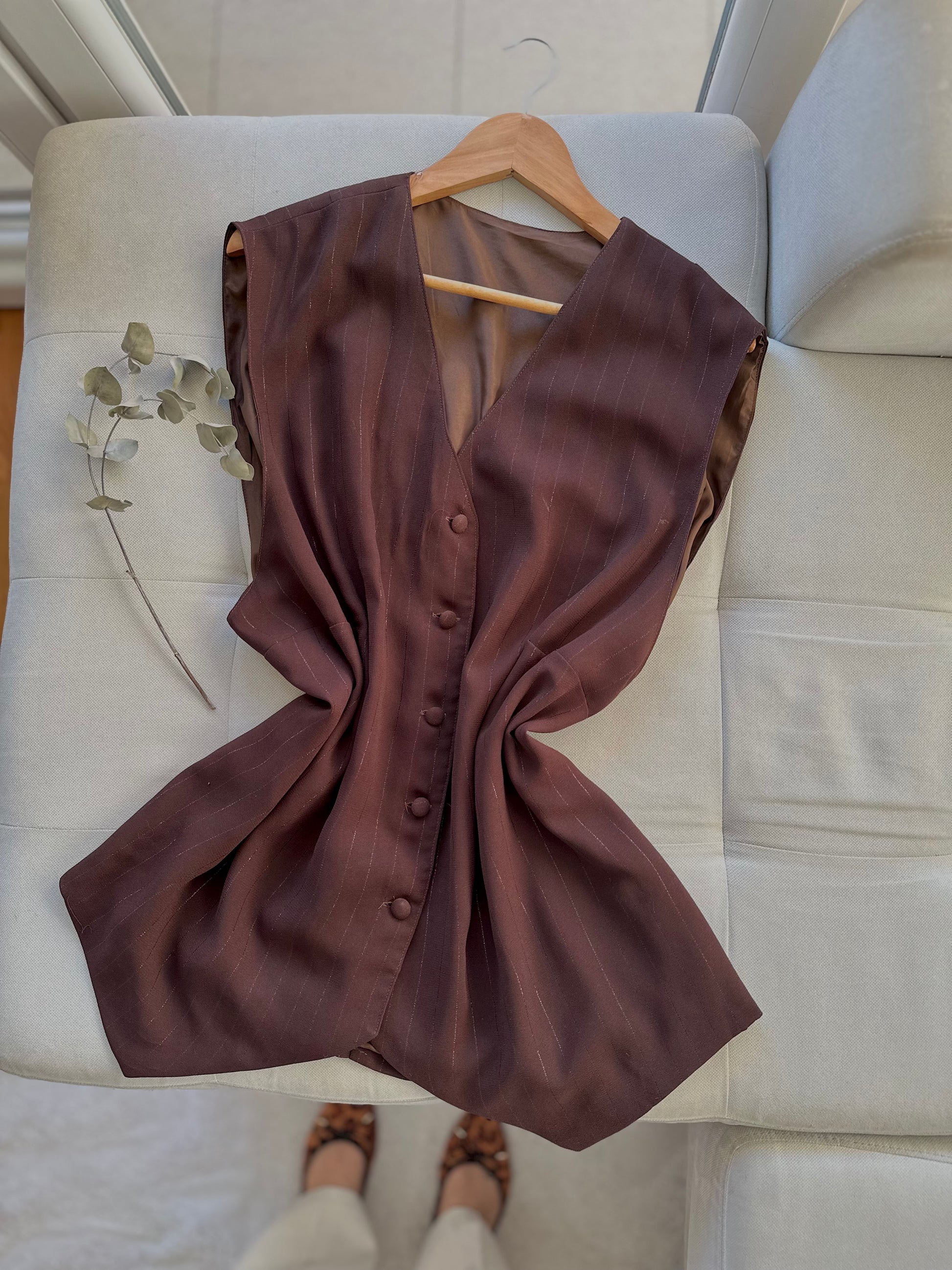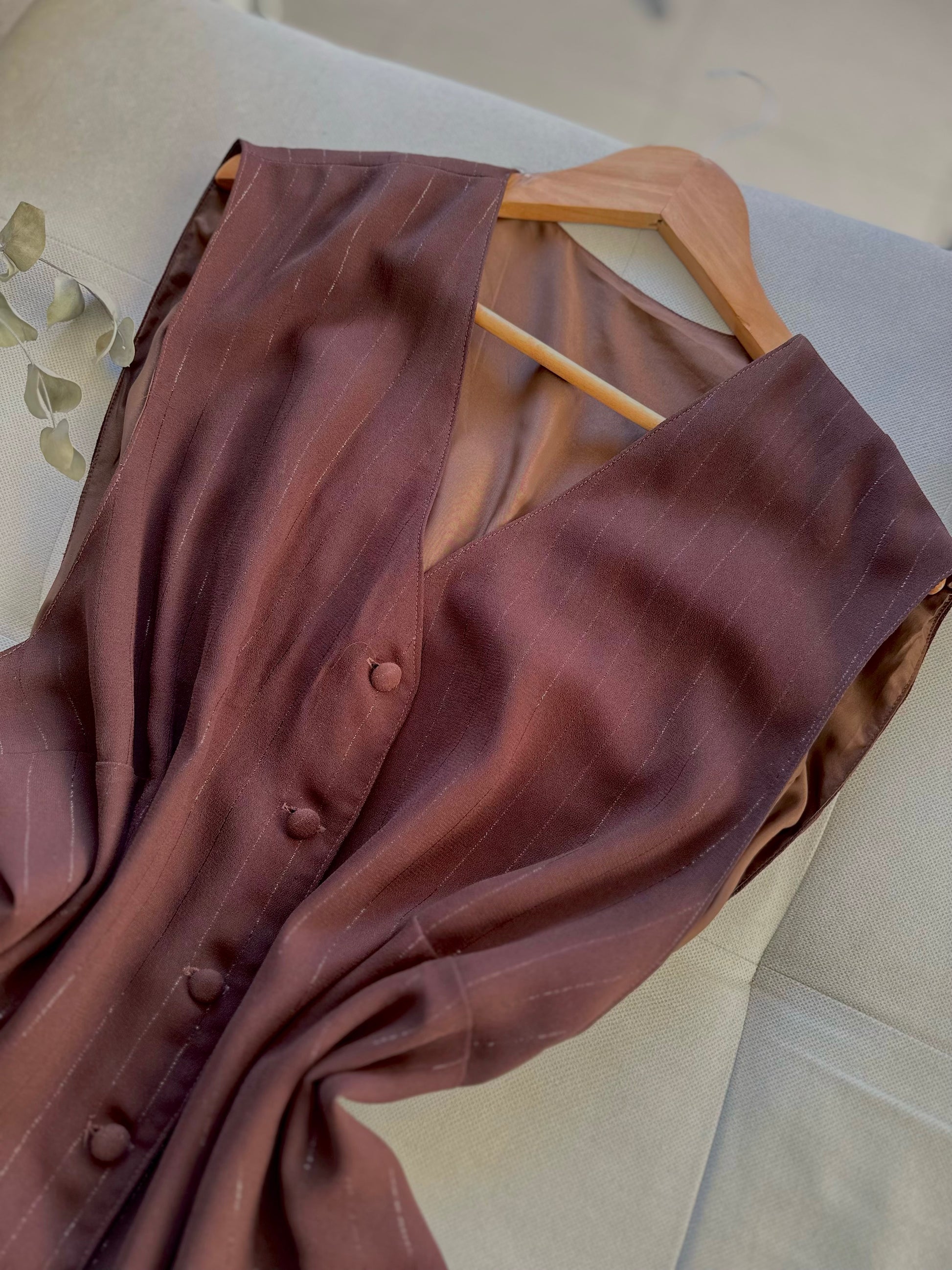 Елек со V-изрез во темно кафеава нијанса, изработен од лесна ткаенина со благ сјај и суптилни вертикални пруги. На предната страна е со копчиња обложени во истата ткаенина како моделот и внатрешна светло кафена постава!