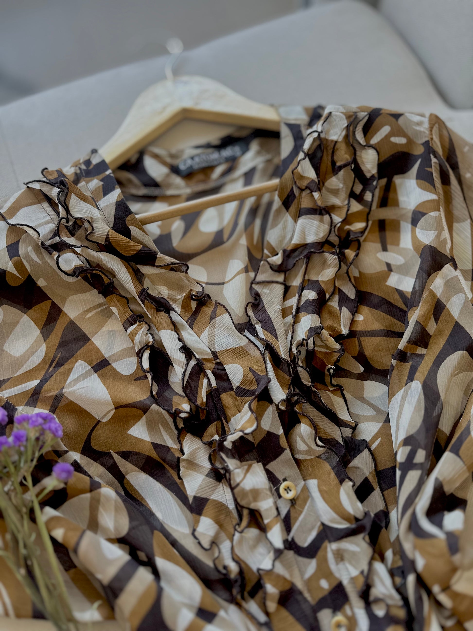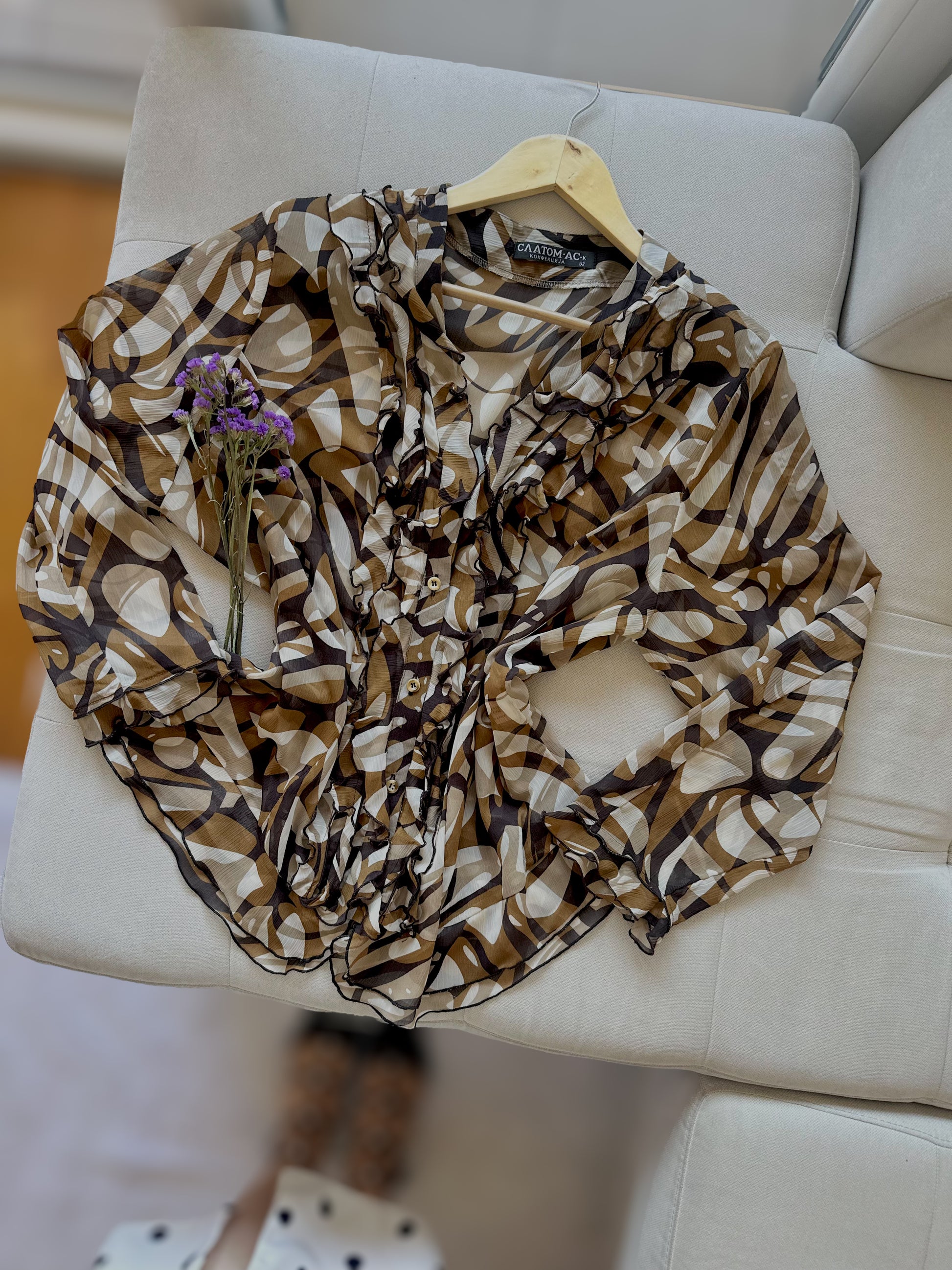 кошула во кафени и крем нијанси со апстрактен дезен, по долги ракави и декоративни набори на предната страна.