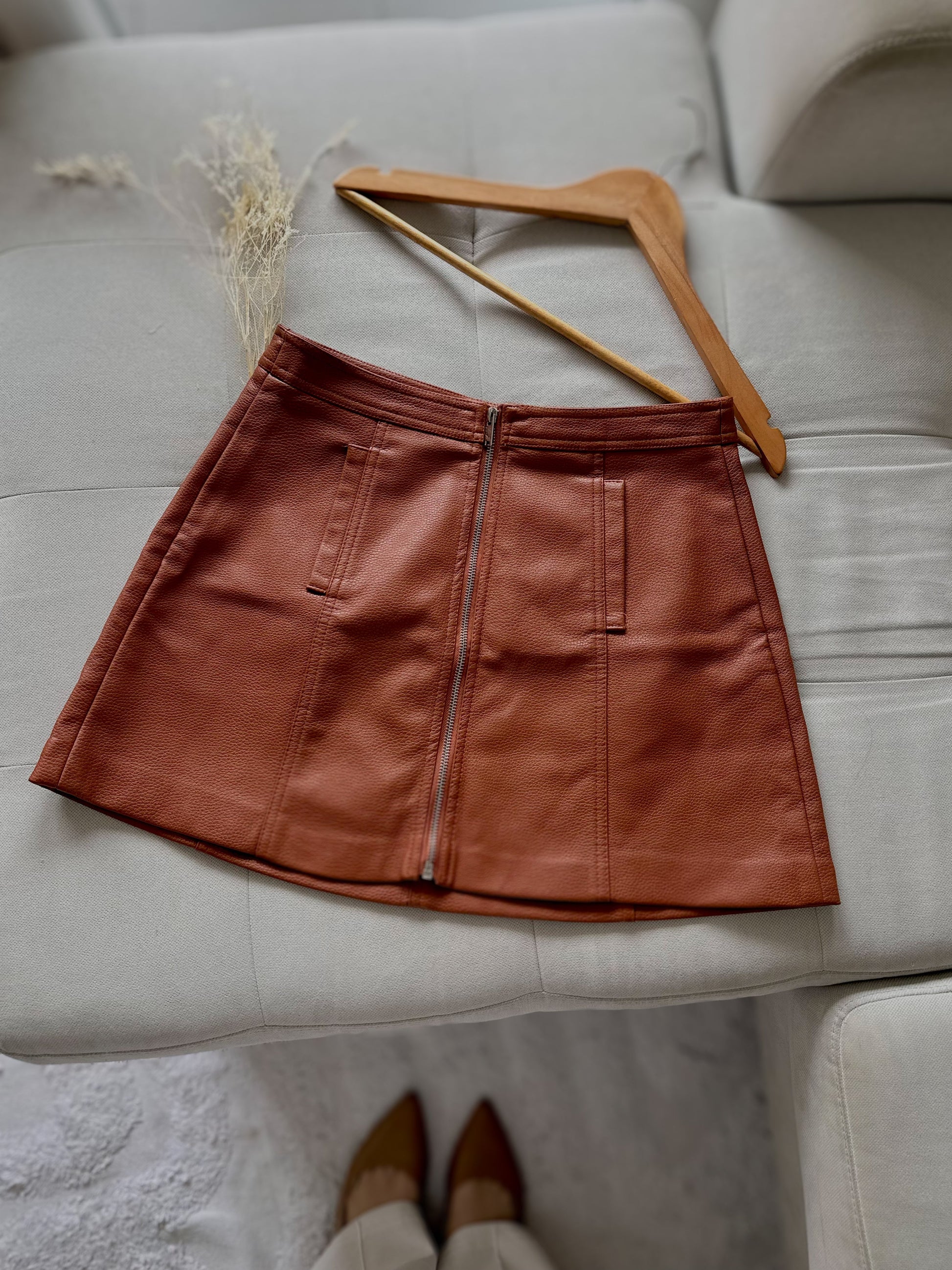 Кожено мини здолниште во кафеав тон со преден патент и џебни детали.