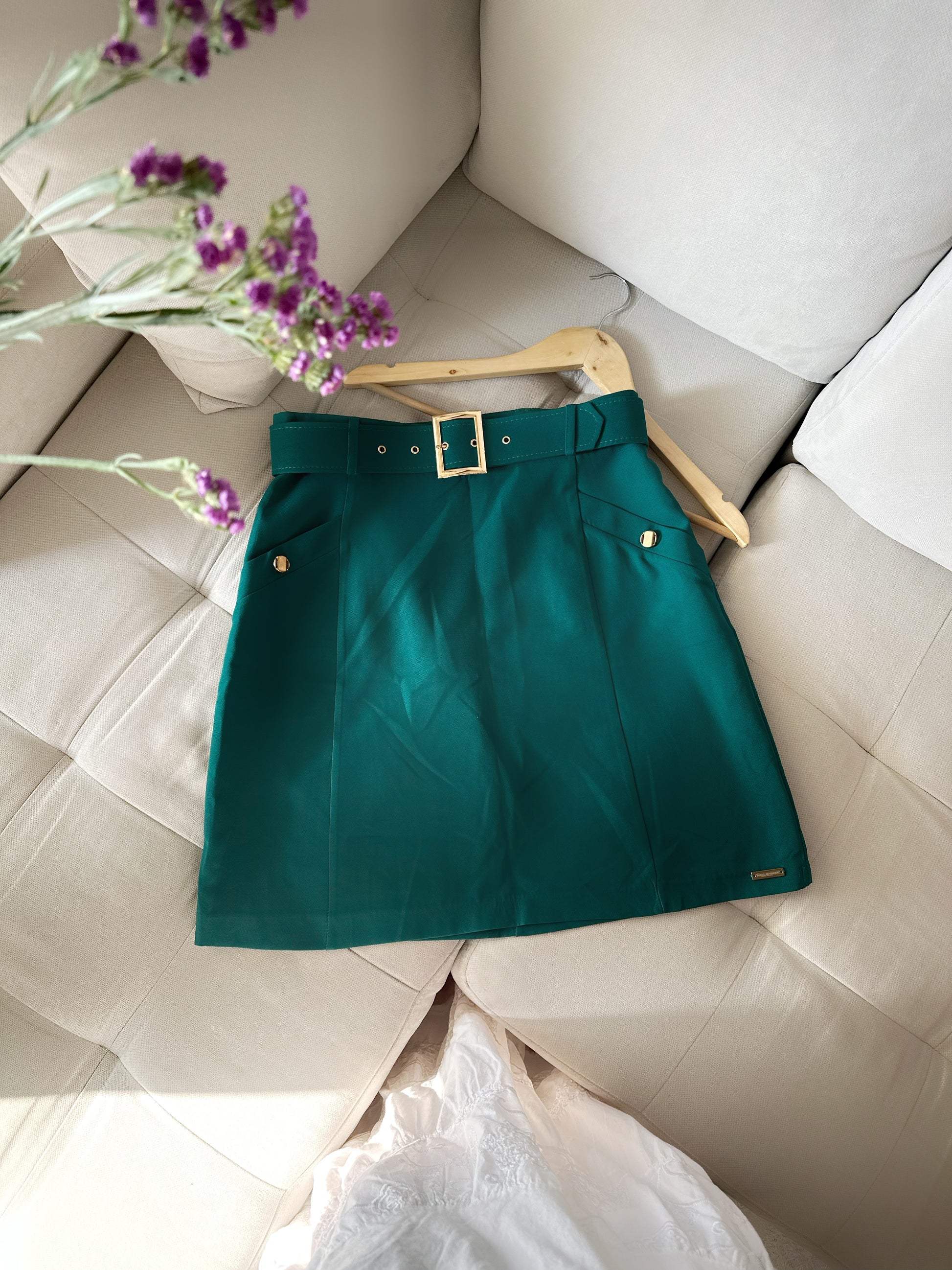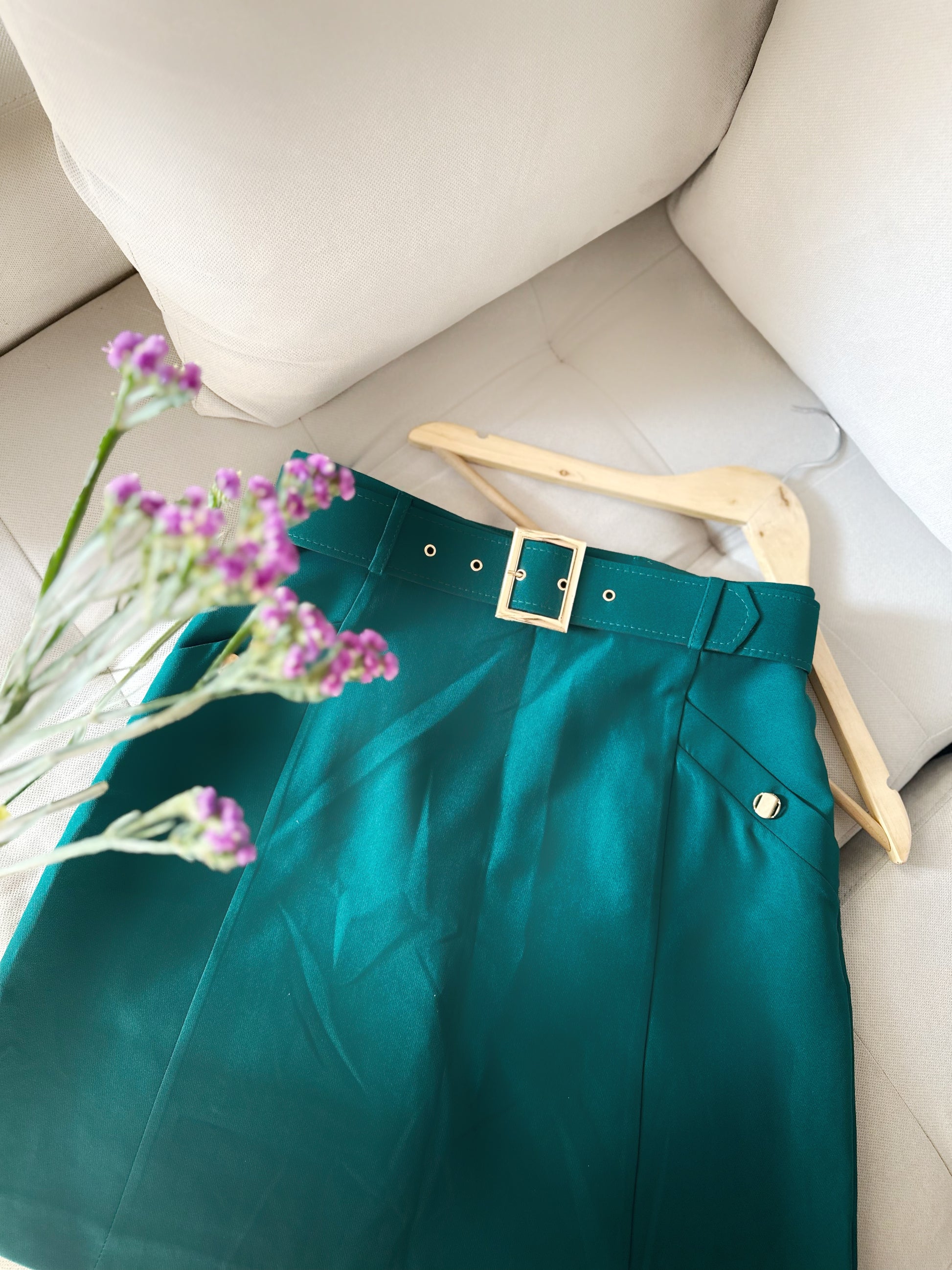 Здолниште во зелена боја со каиш и златна тока. Моделчето е со декоративни копчиња на страничните џебови.