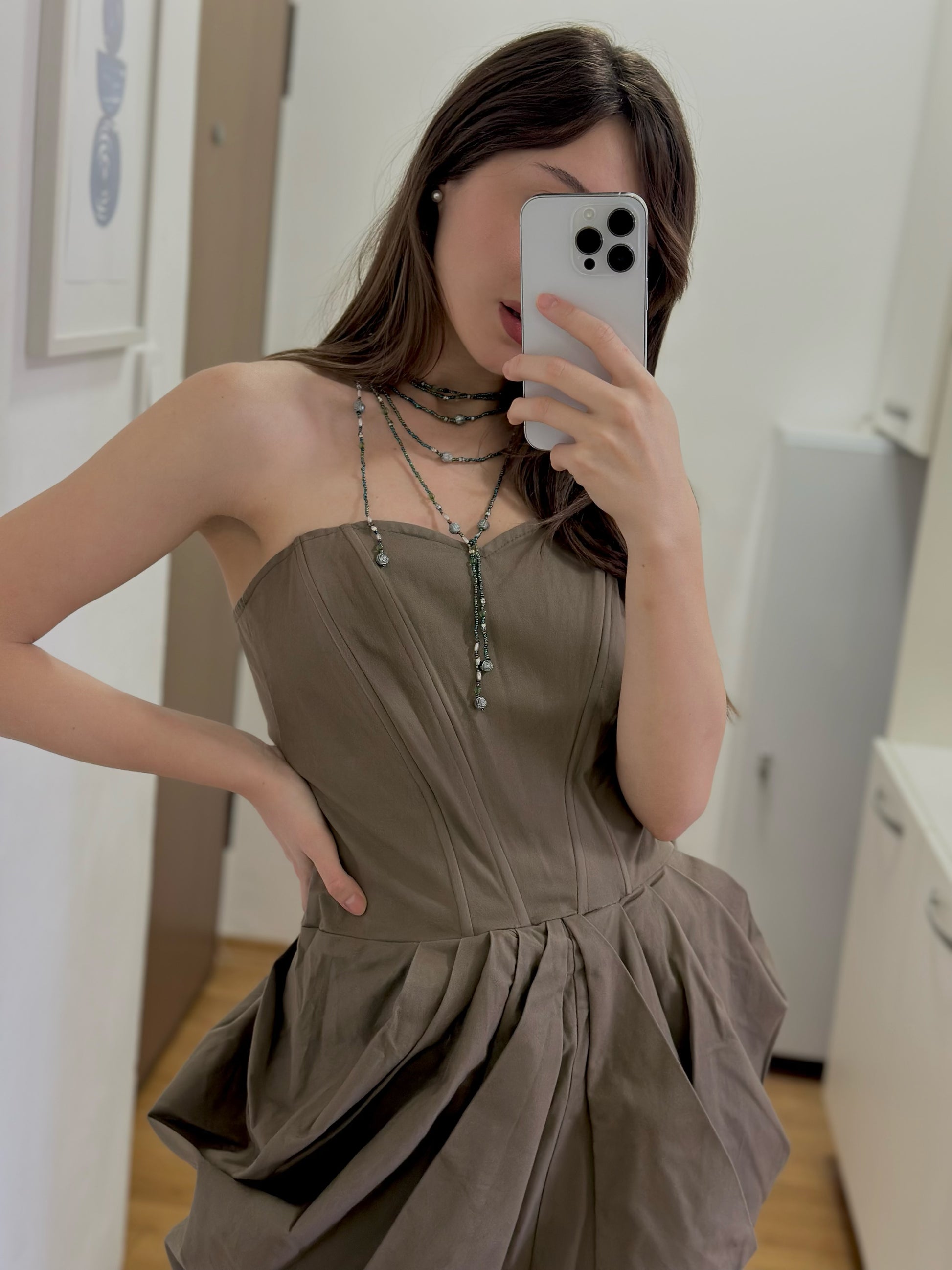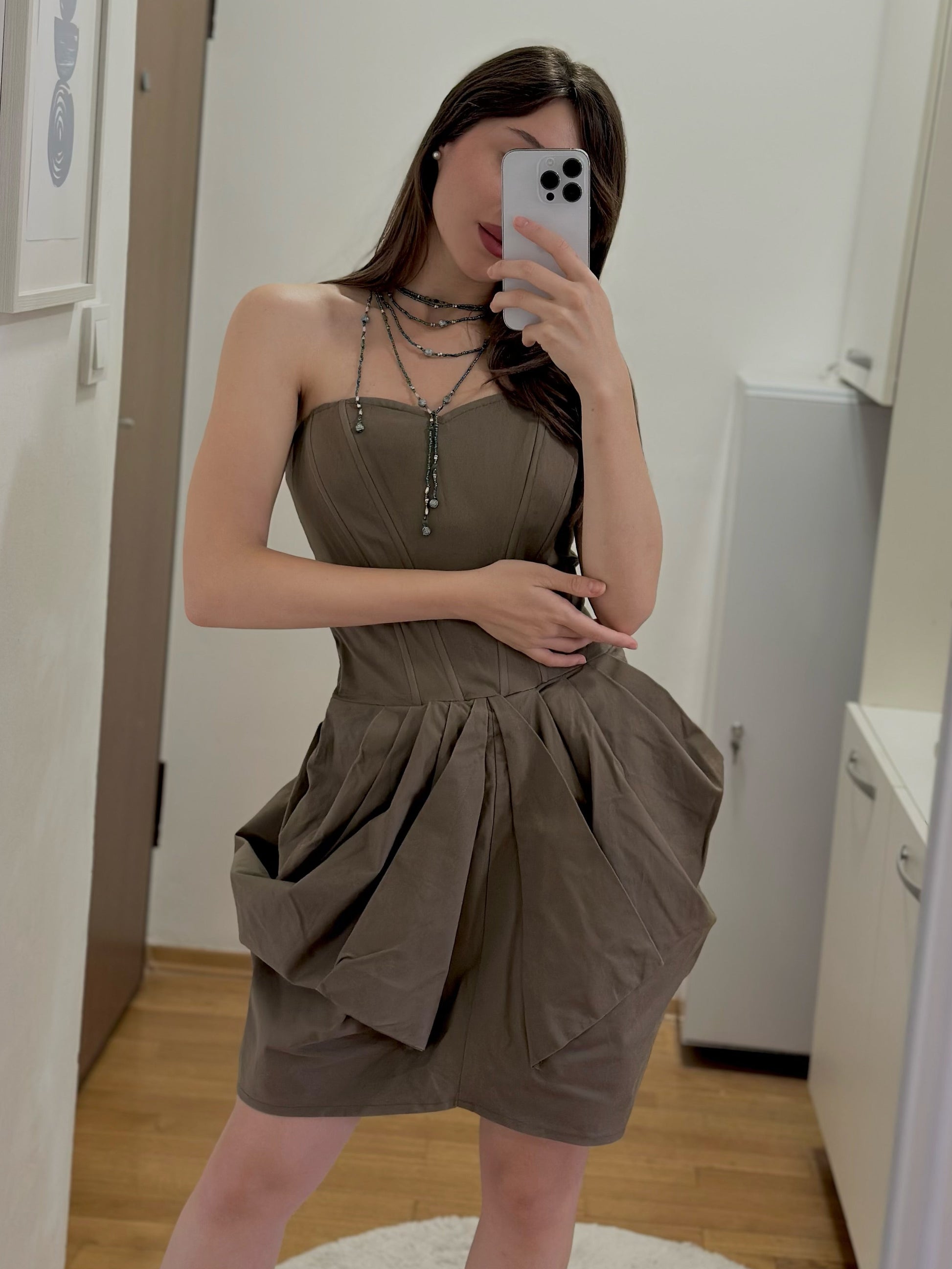 Краток елегантна корсет-фустан во маслинеста боја, со нагласен горен дел и набори во долниот дел. На задната страна има внатрешен патент, а материјалот содржи еластан за поголема удобност.