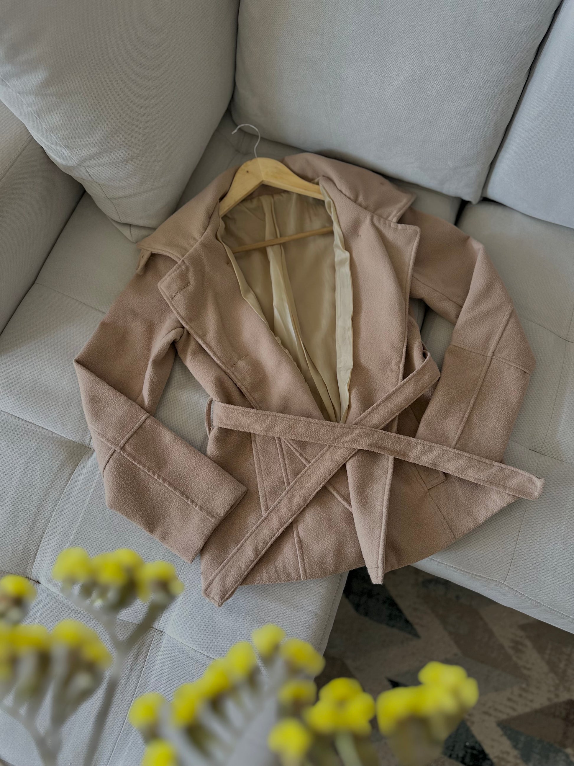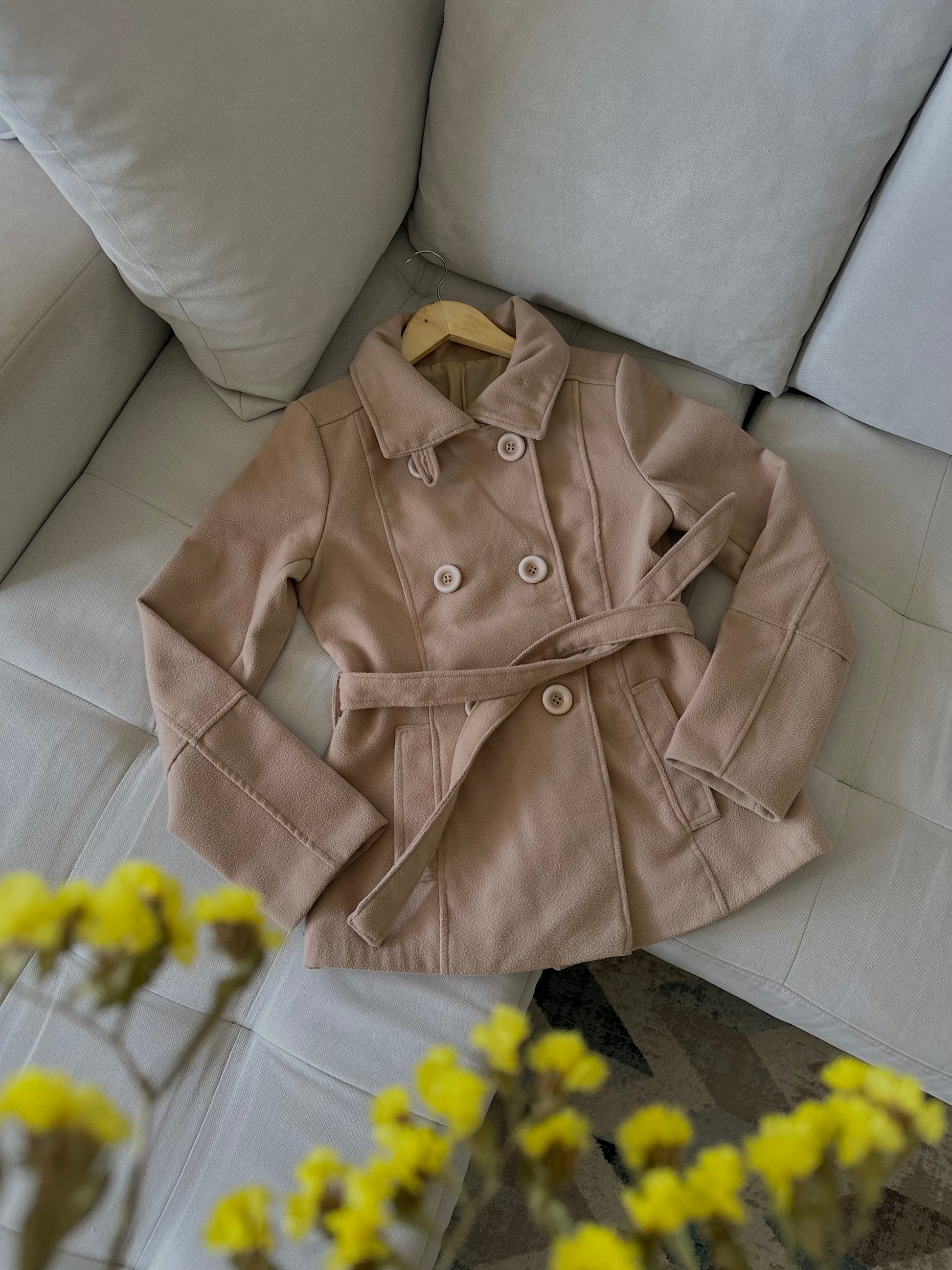 Крем капут со класичен крој, двојно копчање и појас за врзување. Елегантен и практичен избор за студени денови.