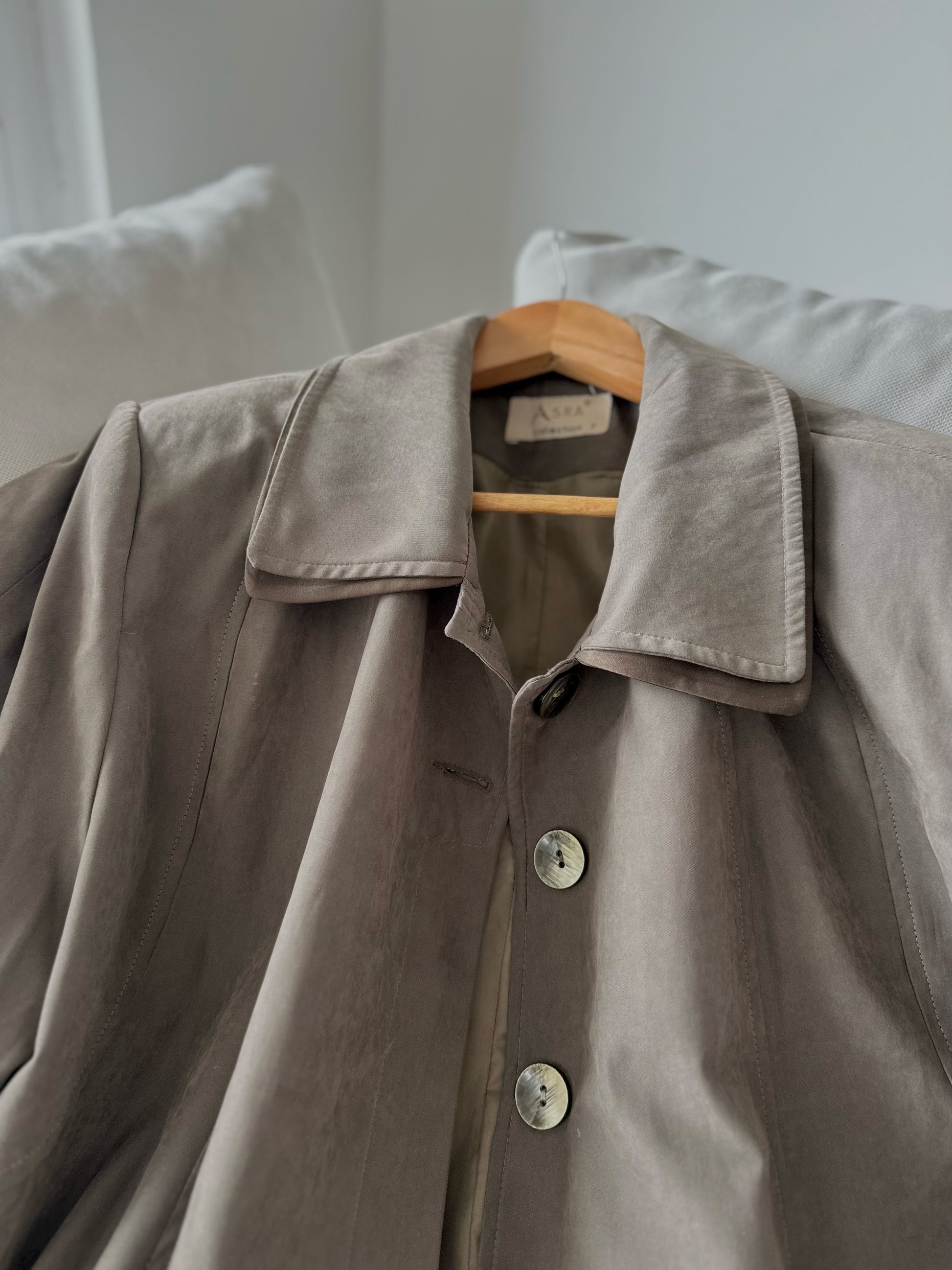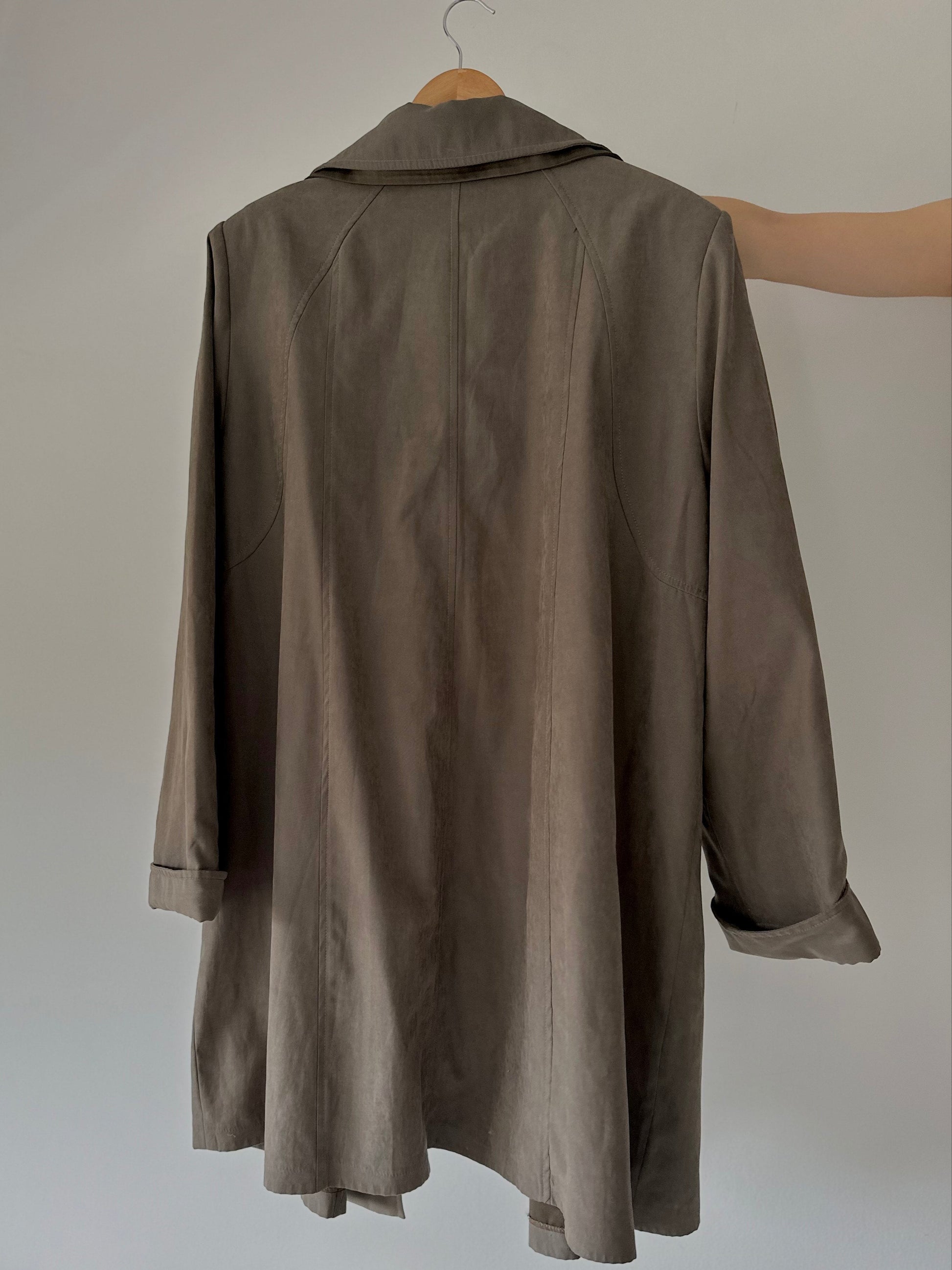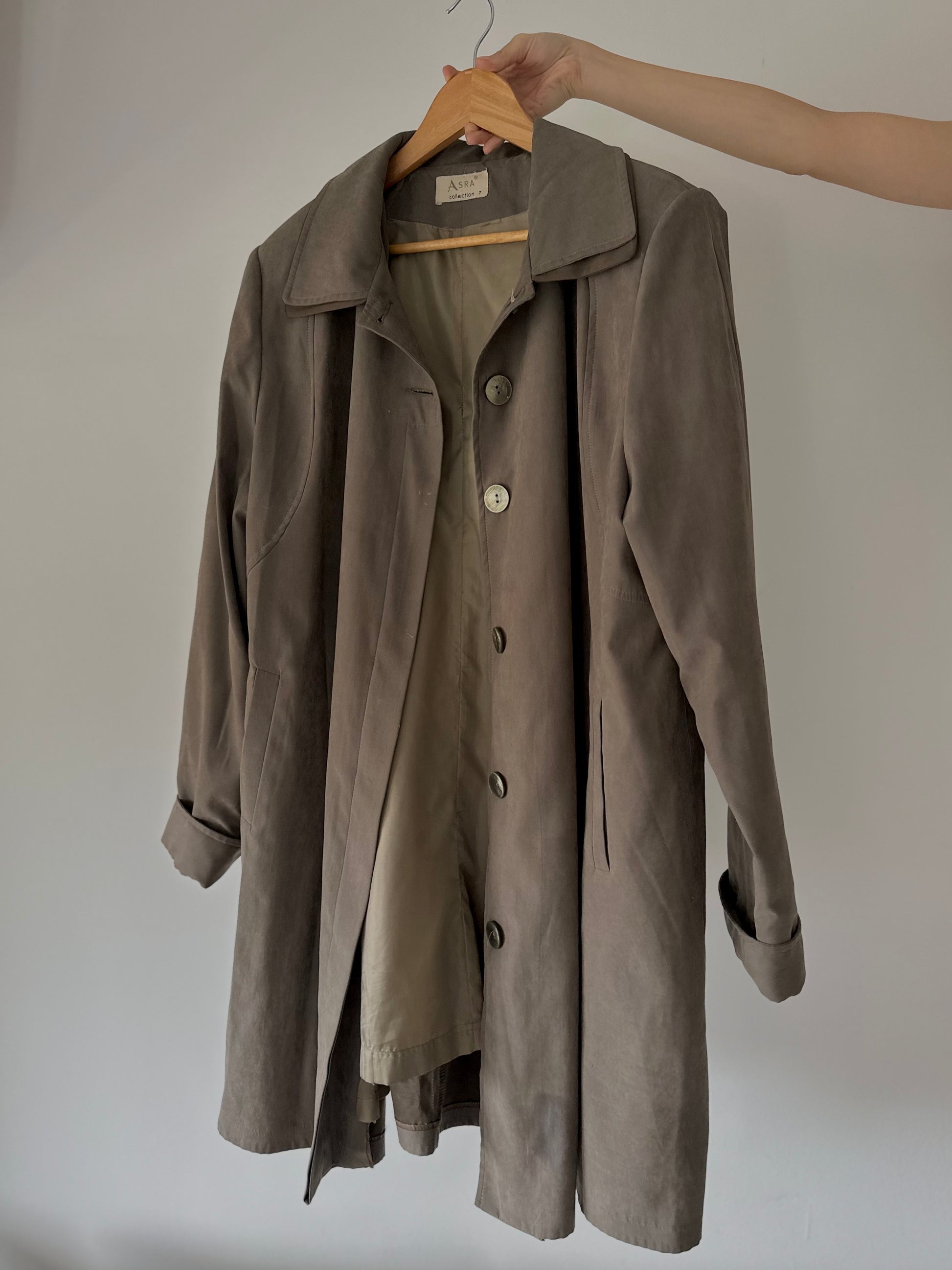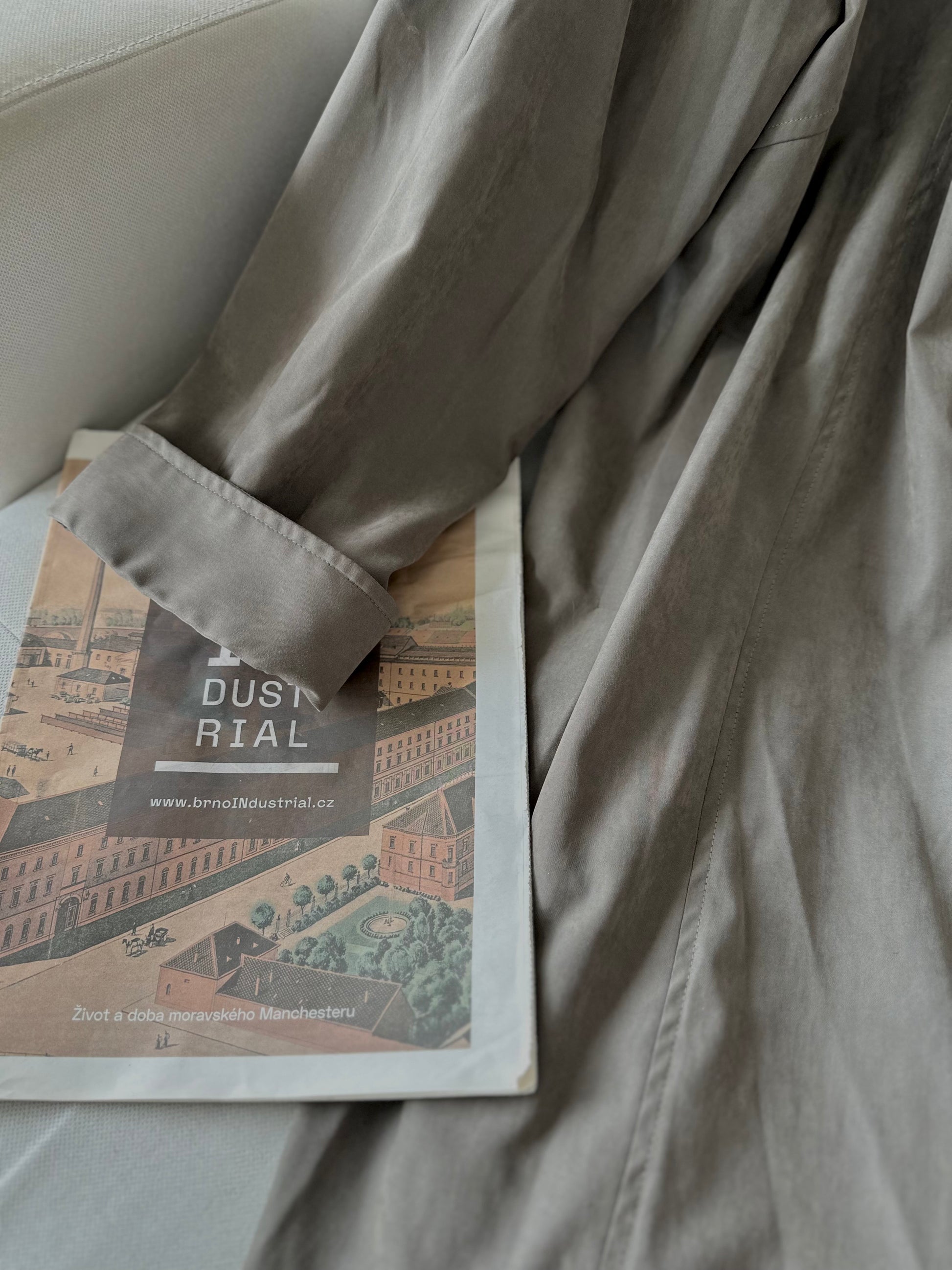 Мантил со класичен крој, копчиња на предната страна и странични џебови, во кафеникава боја. Моделчето е со двојна декоративна јака.