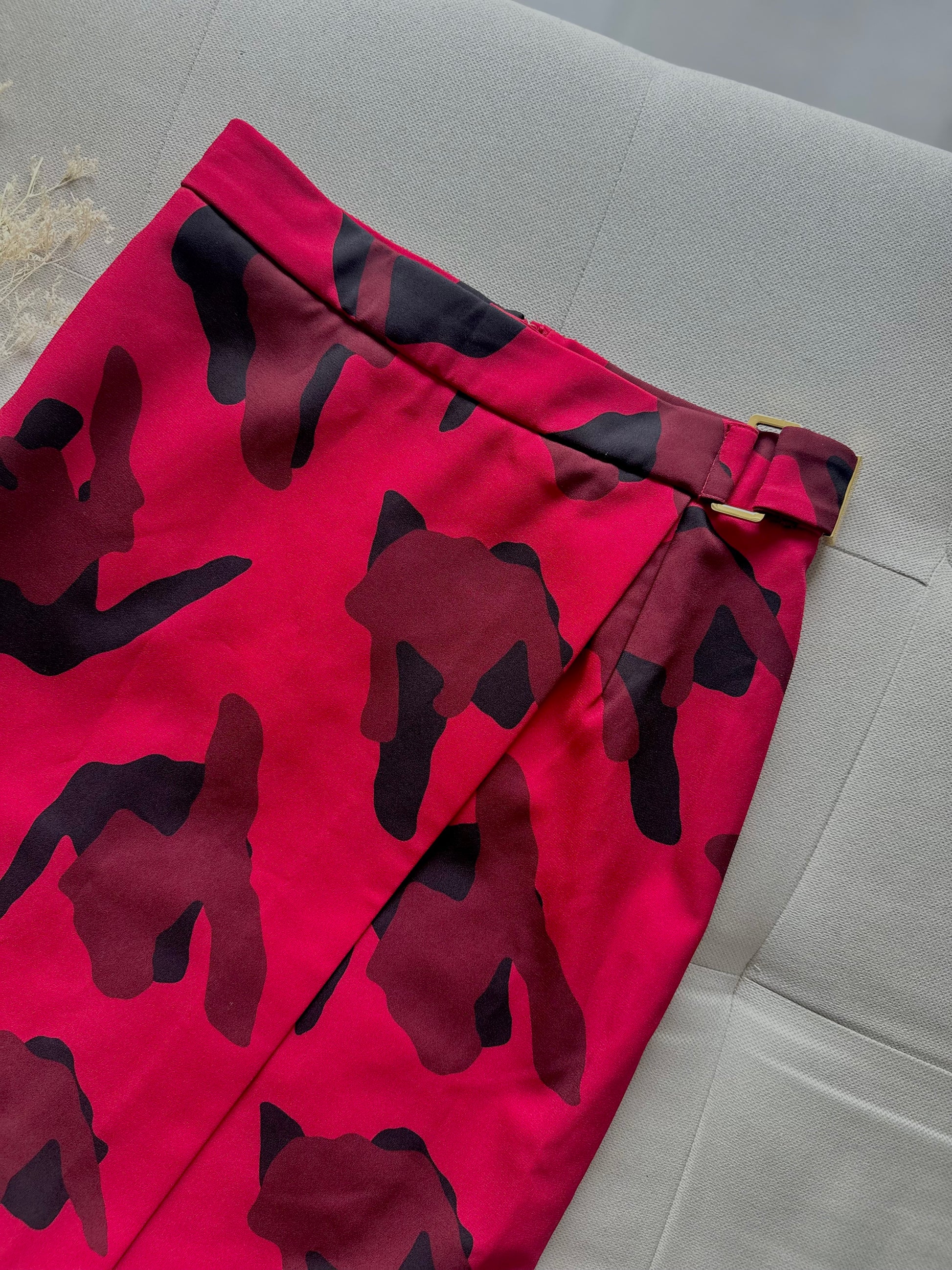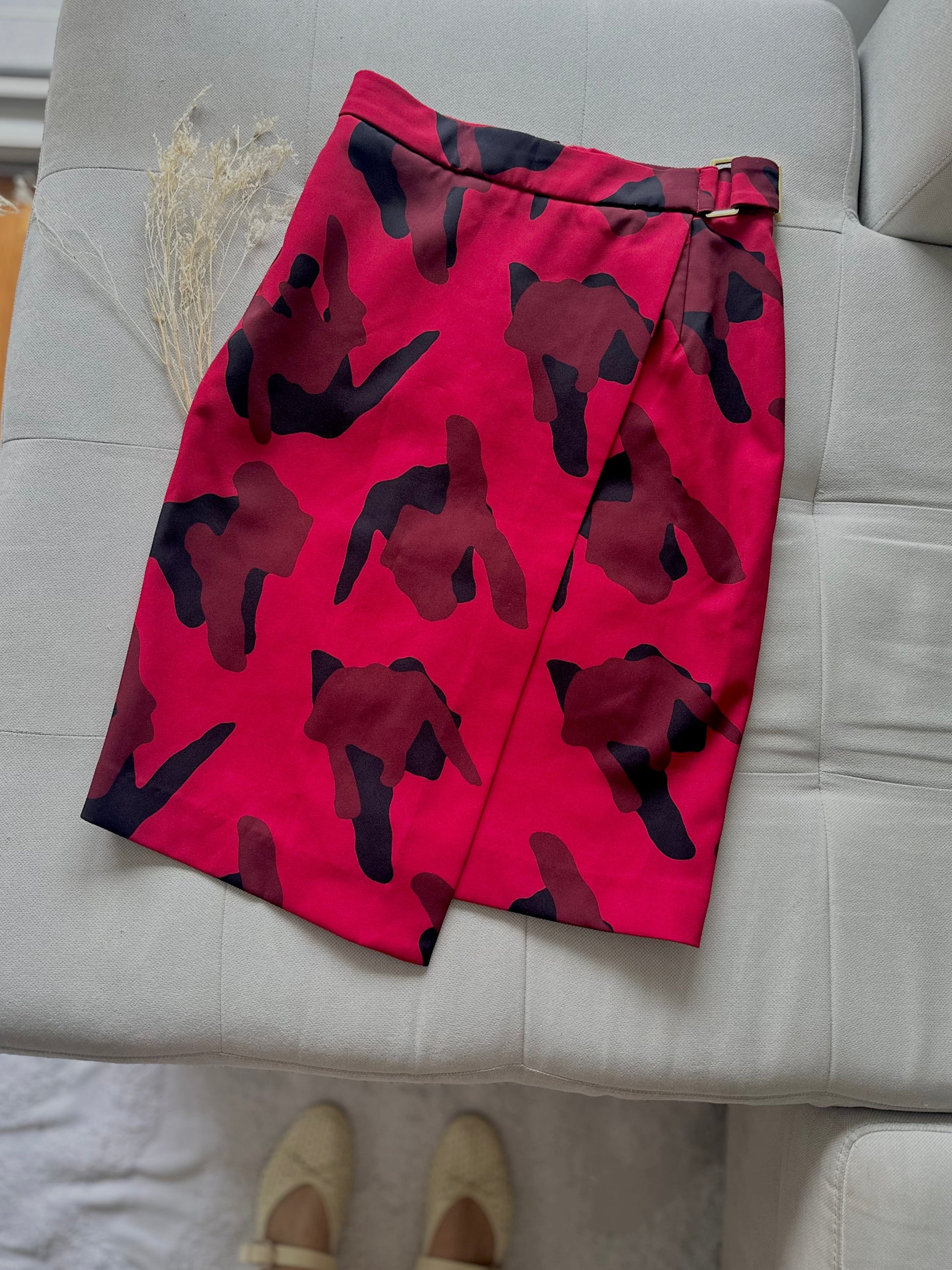 Молив здолниште во црвена боја со апстрактен принт во темни тонови. Асиметричен крој и метална тока на половината.