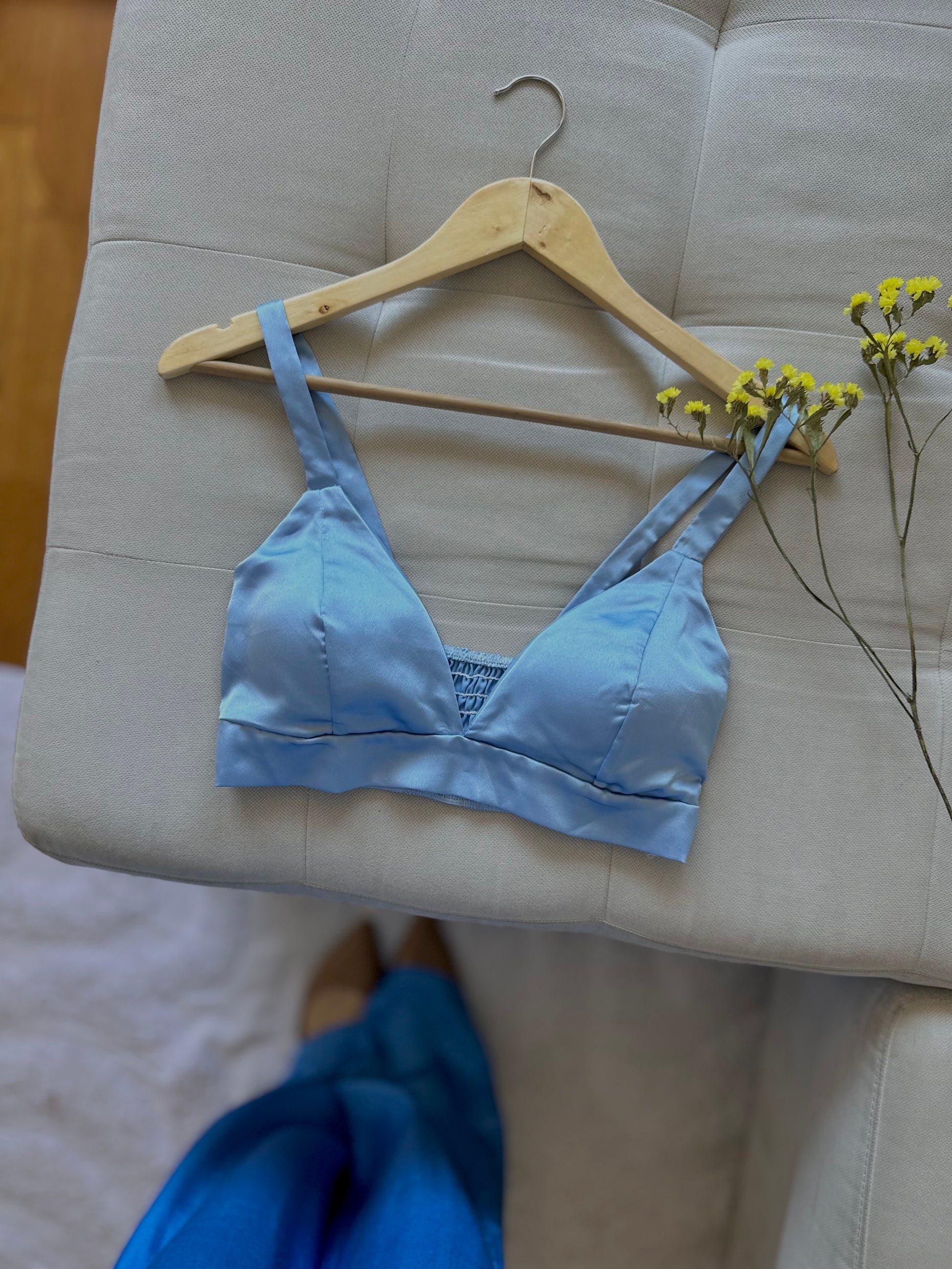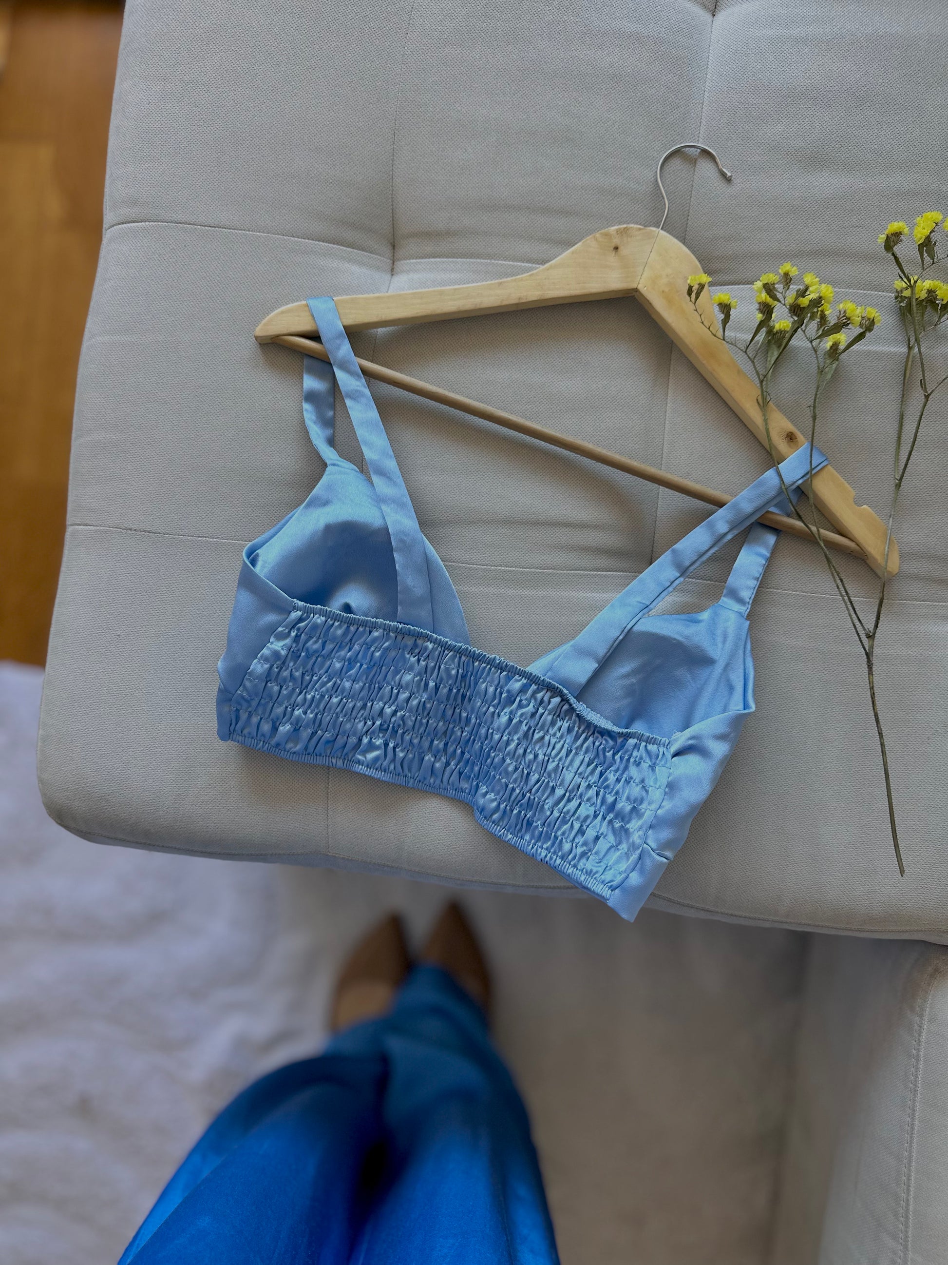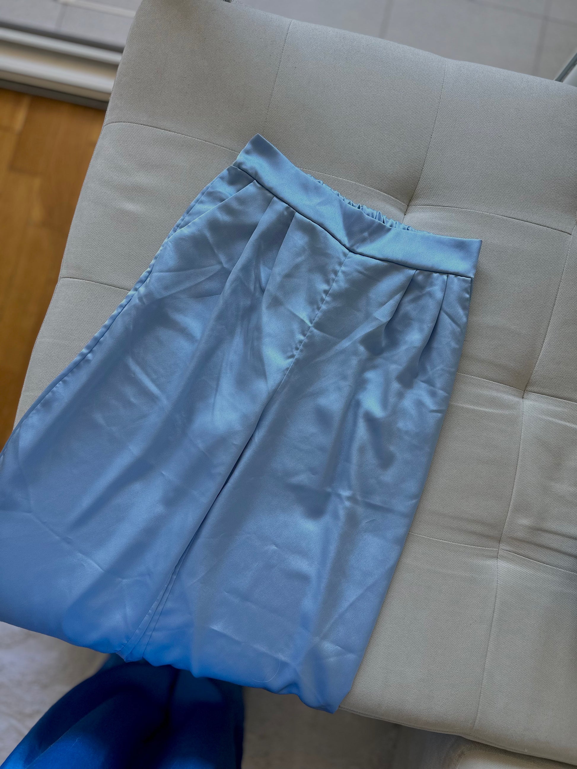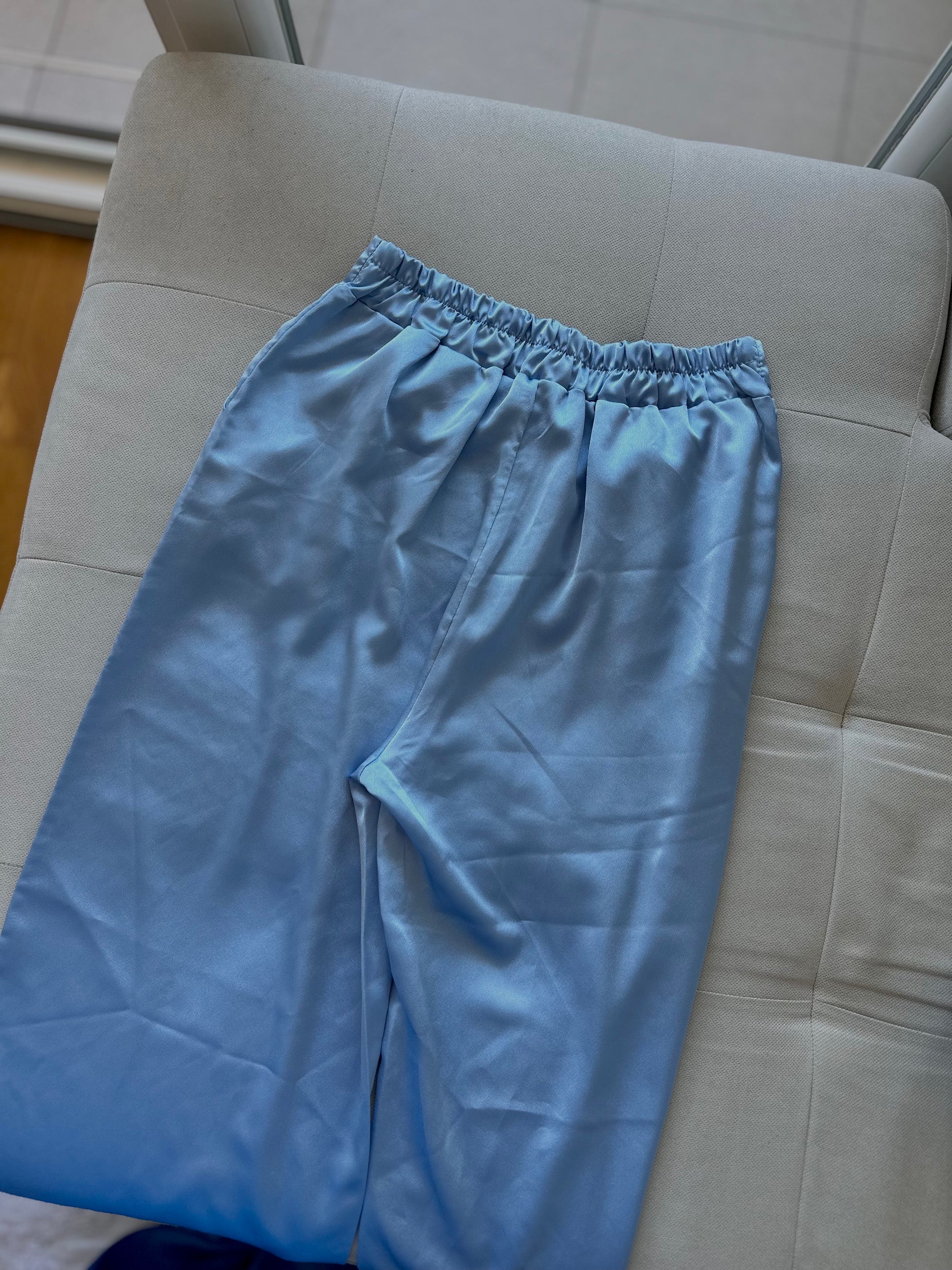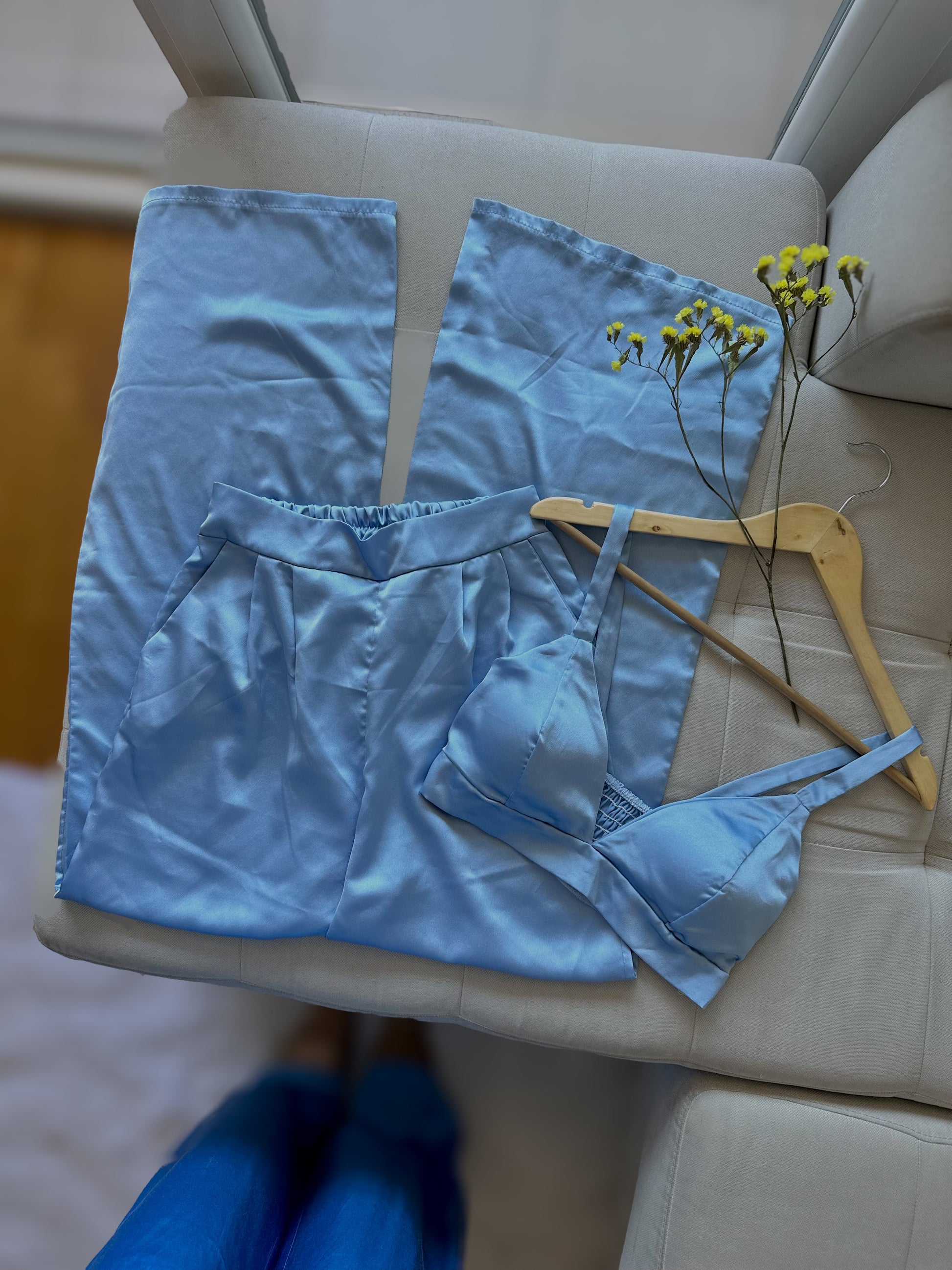Сет во нежна небесно сина боја. Содржи кратко топче со тенки прерамки и еластичен дел на грбот, и широки панталони со висок струк и ластик позади.