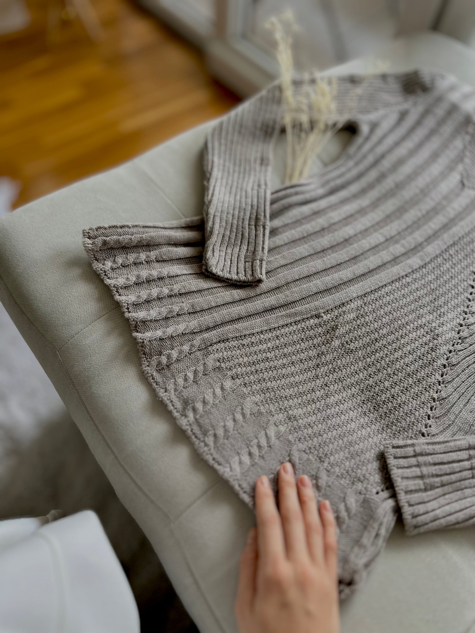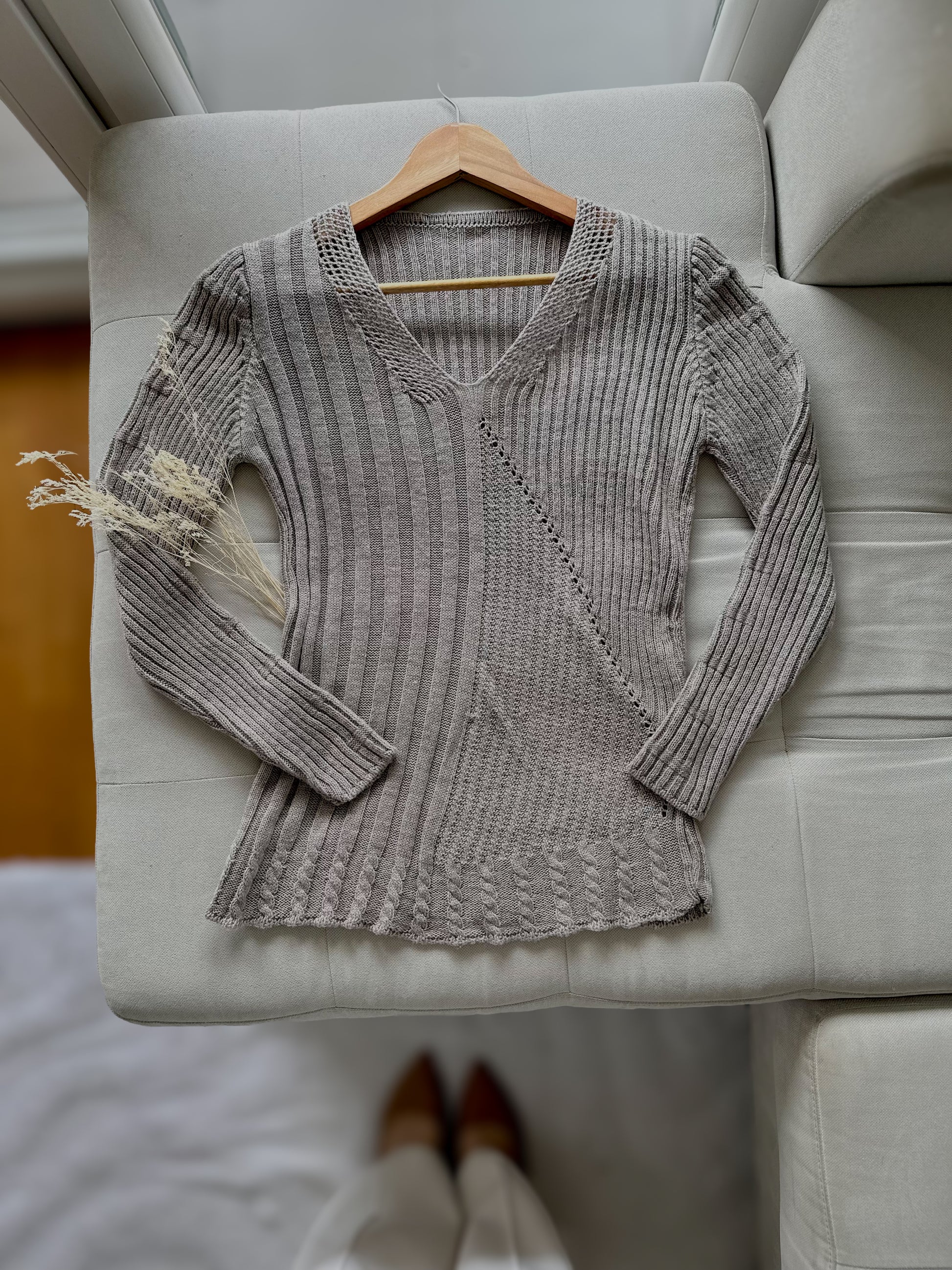 Плетен џемпер со V-израз и долг ракав, во сив тон.