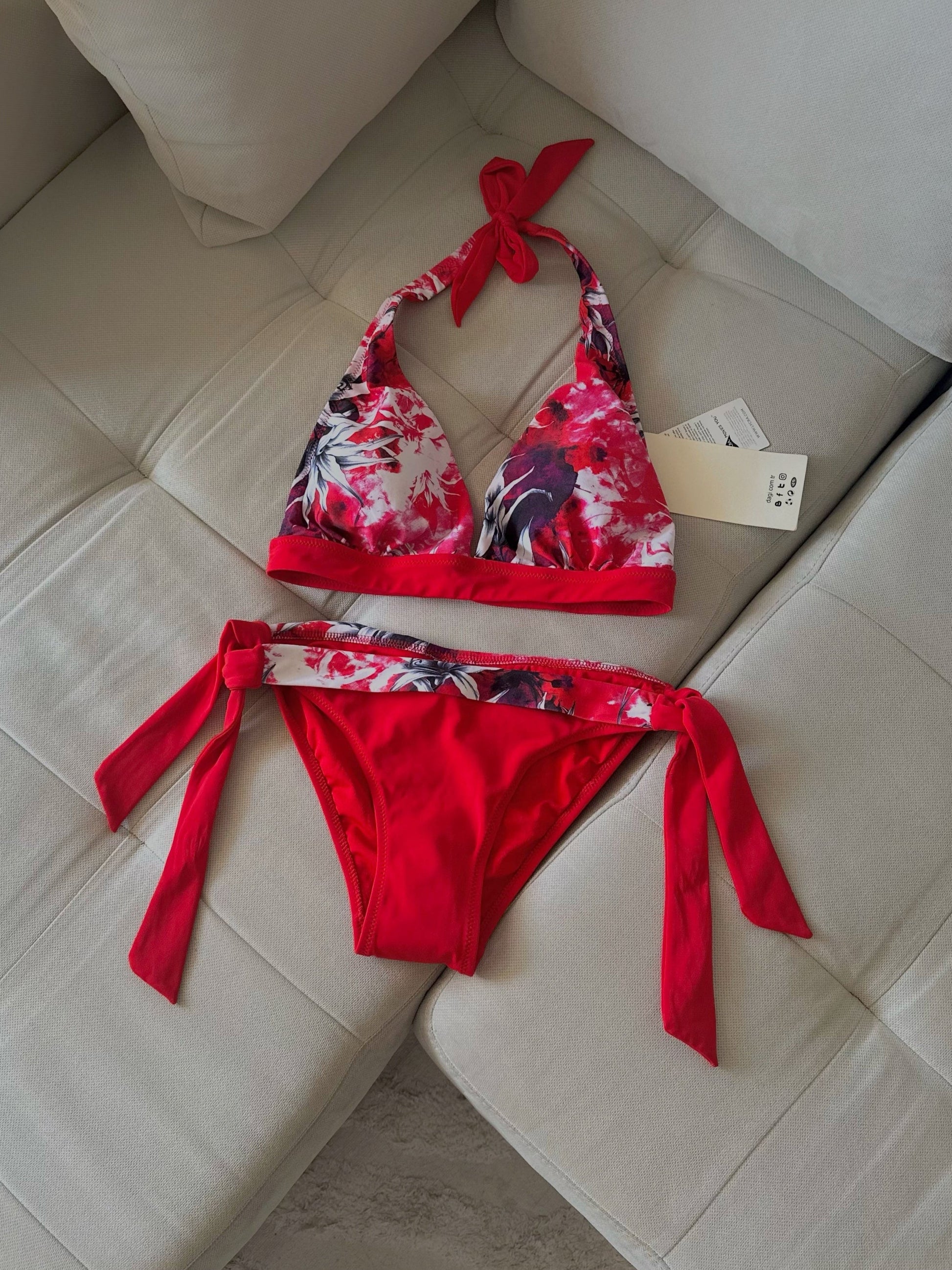 Црвен костим за капење со цветен принт. Женствен и модерен избор за плажа.