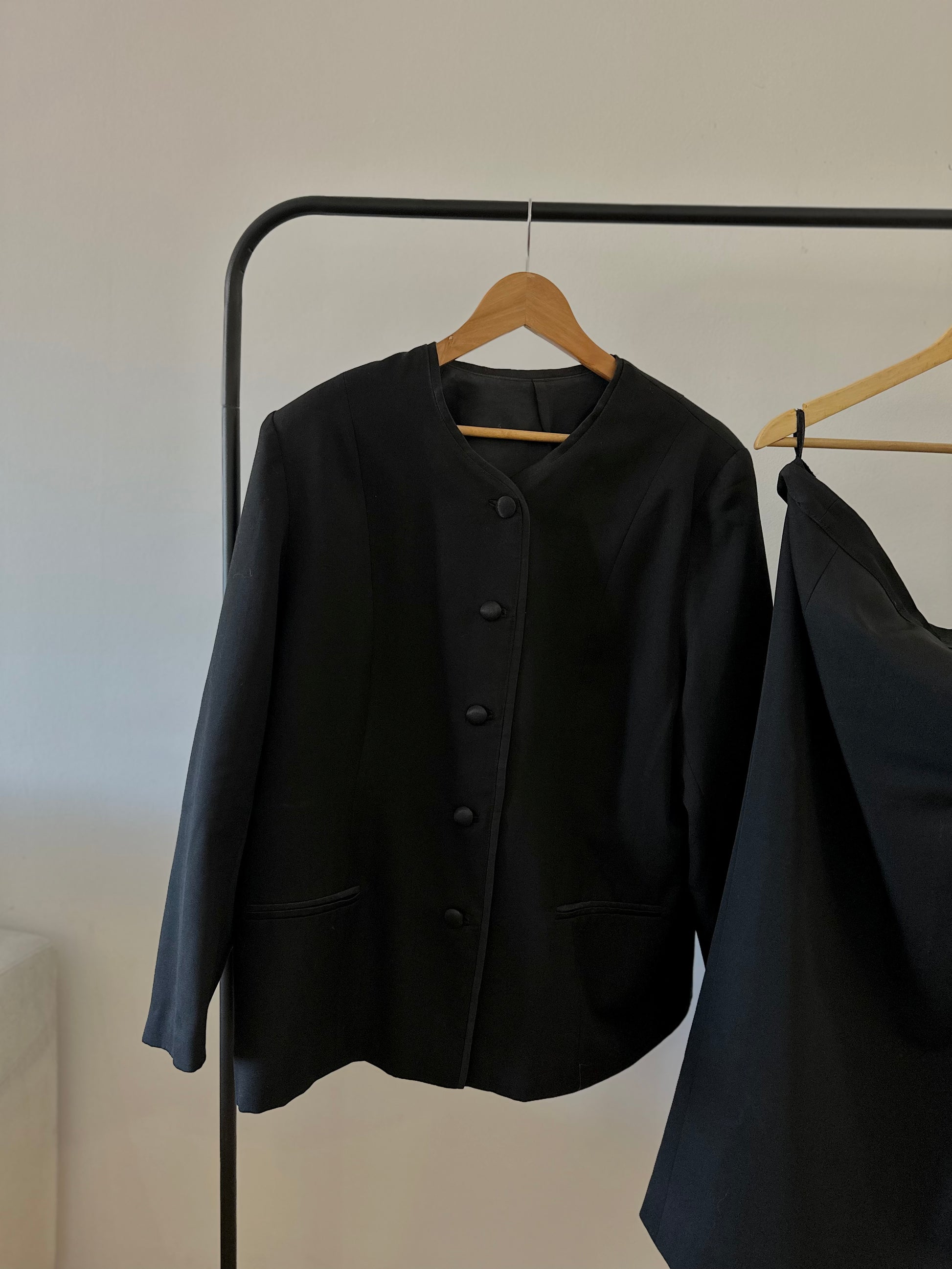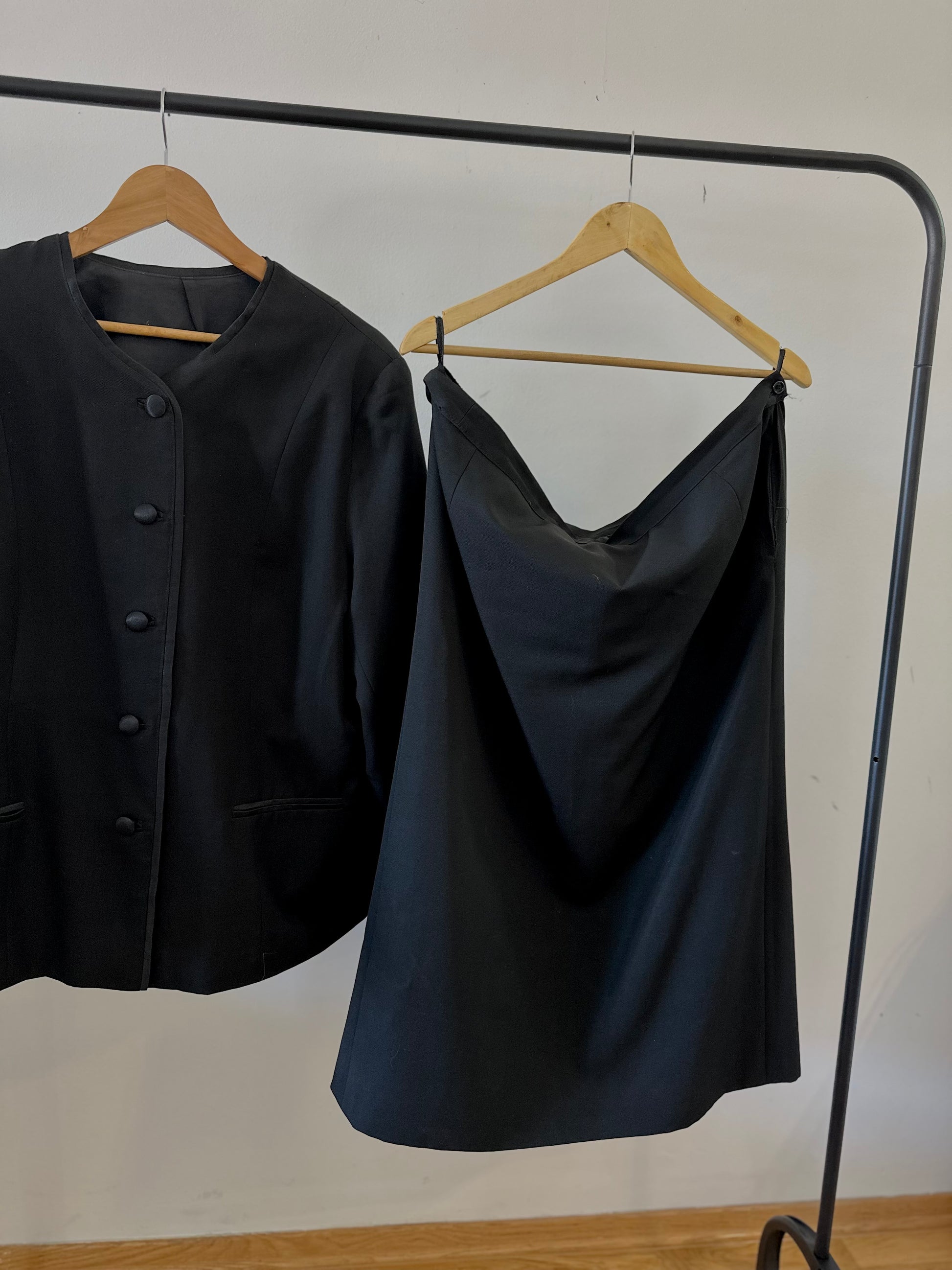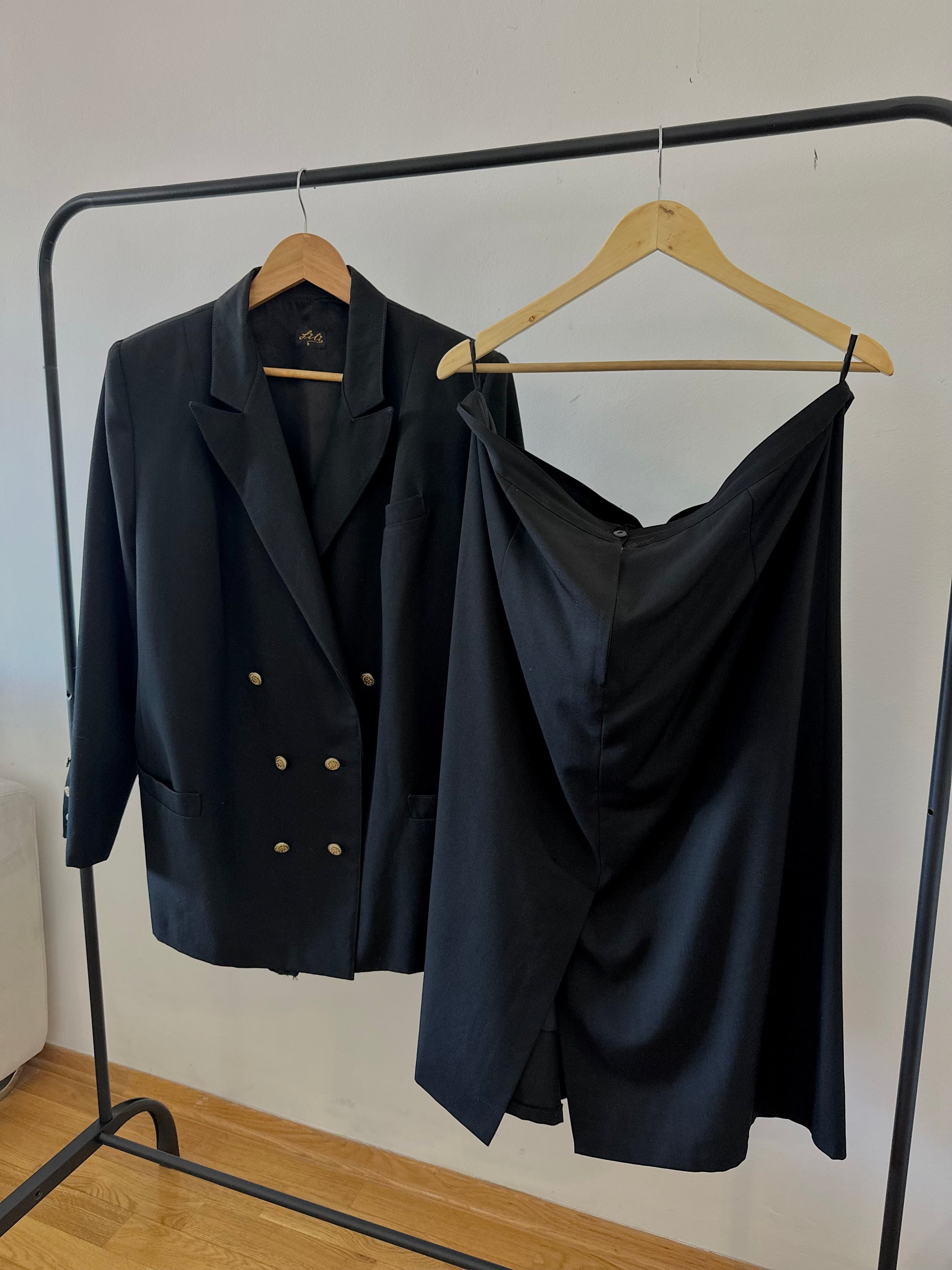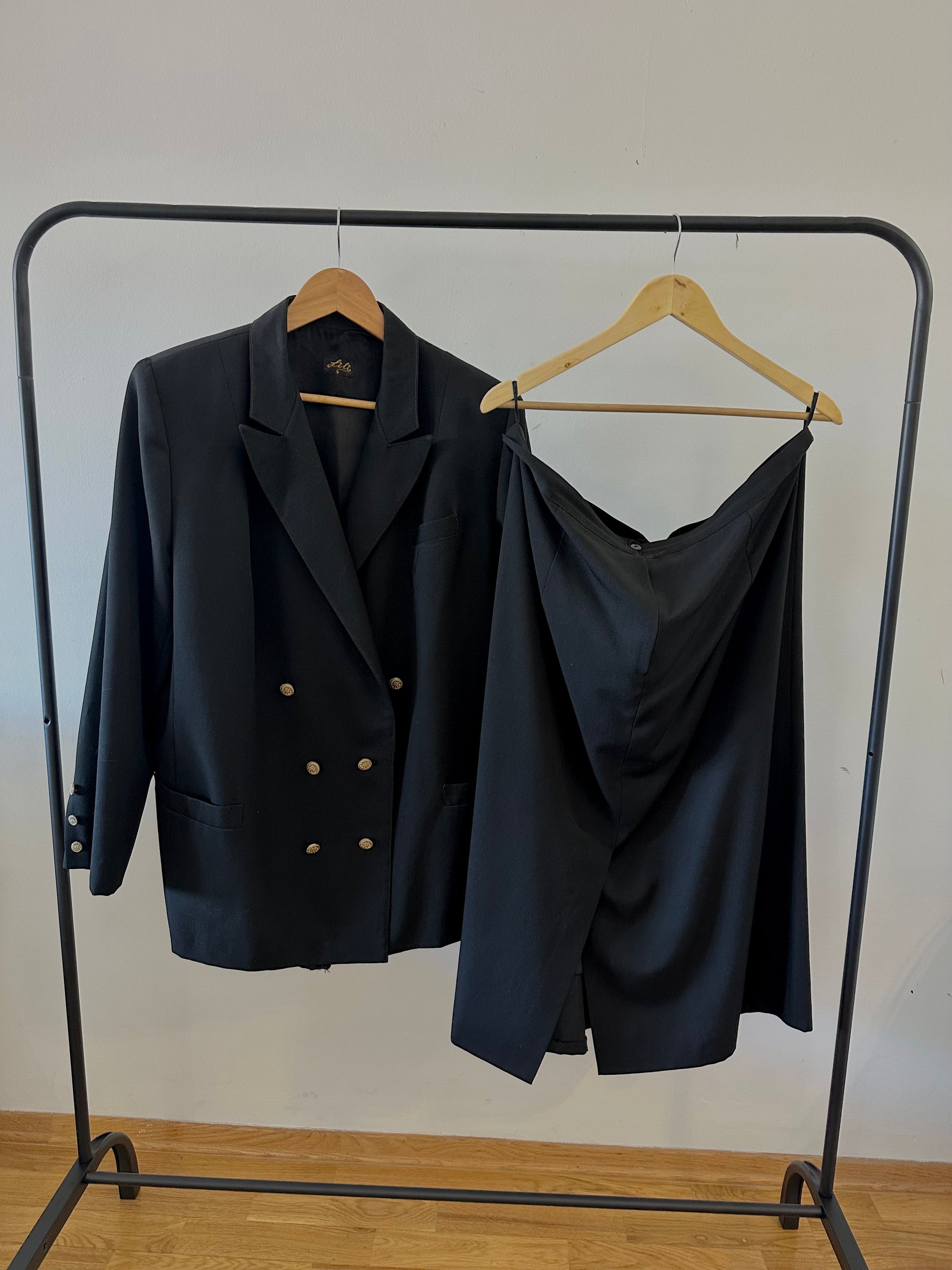 Сет црно од сако и сукња. Сакото е со копчање во два реда, декоративни копчиња на ракавите и предни џебови, додека сукњата е со класичен, молив крој.