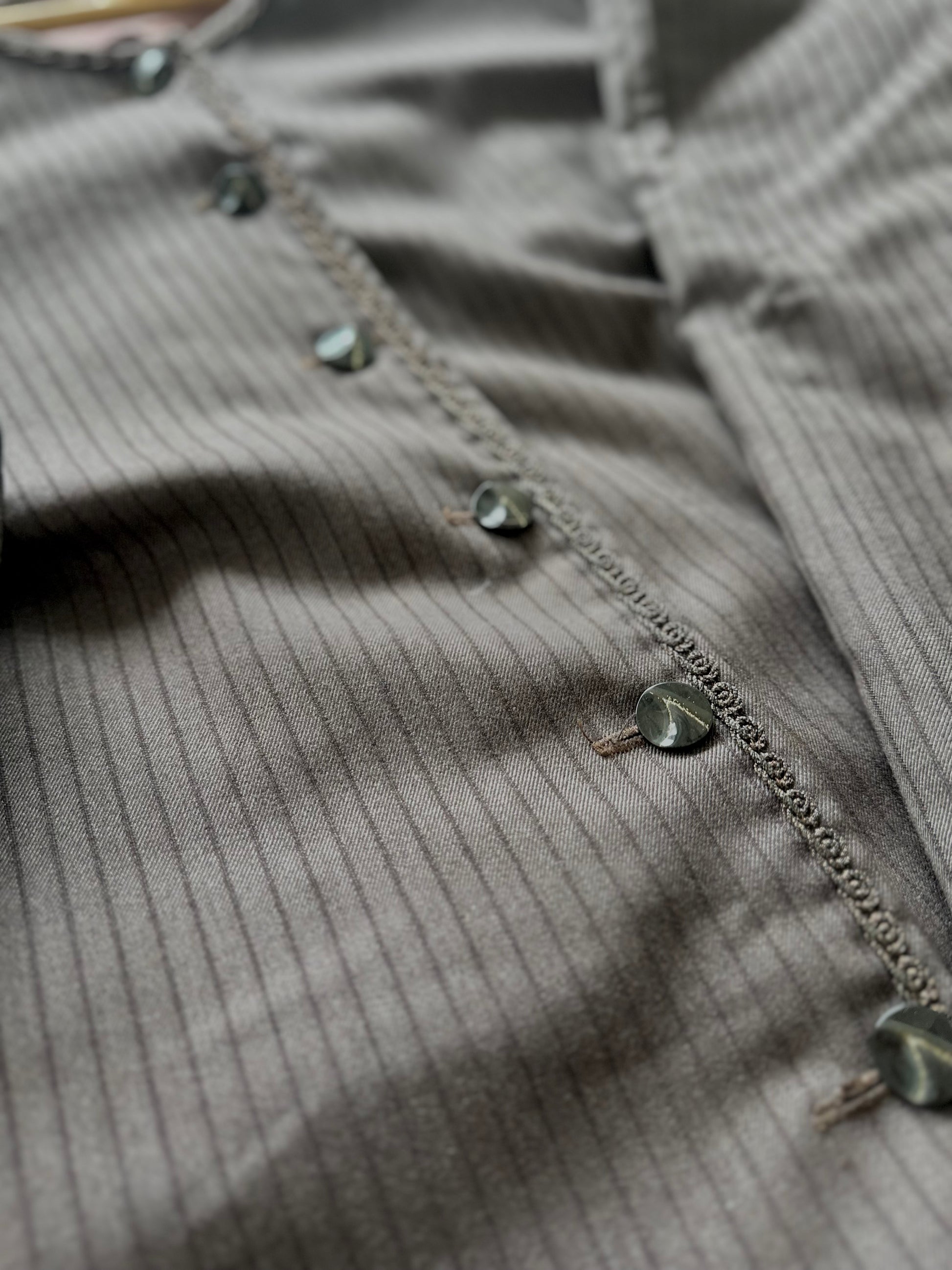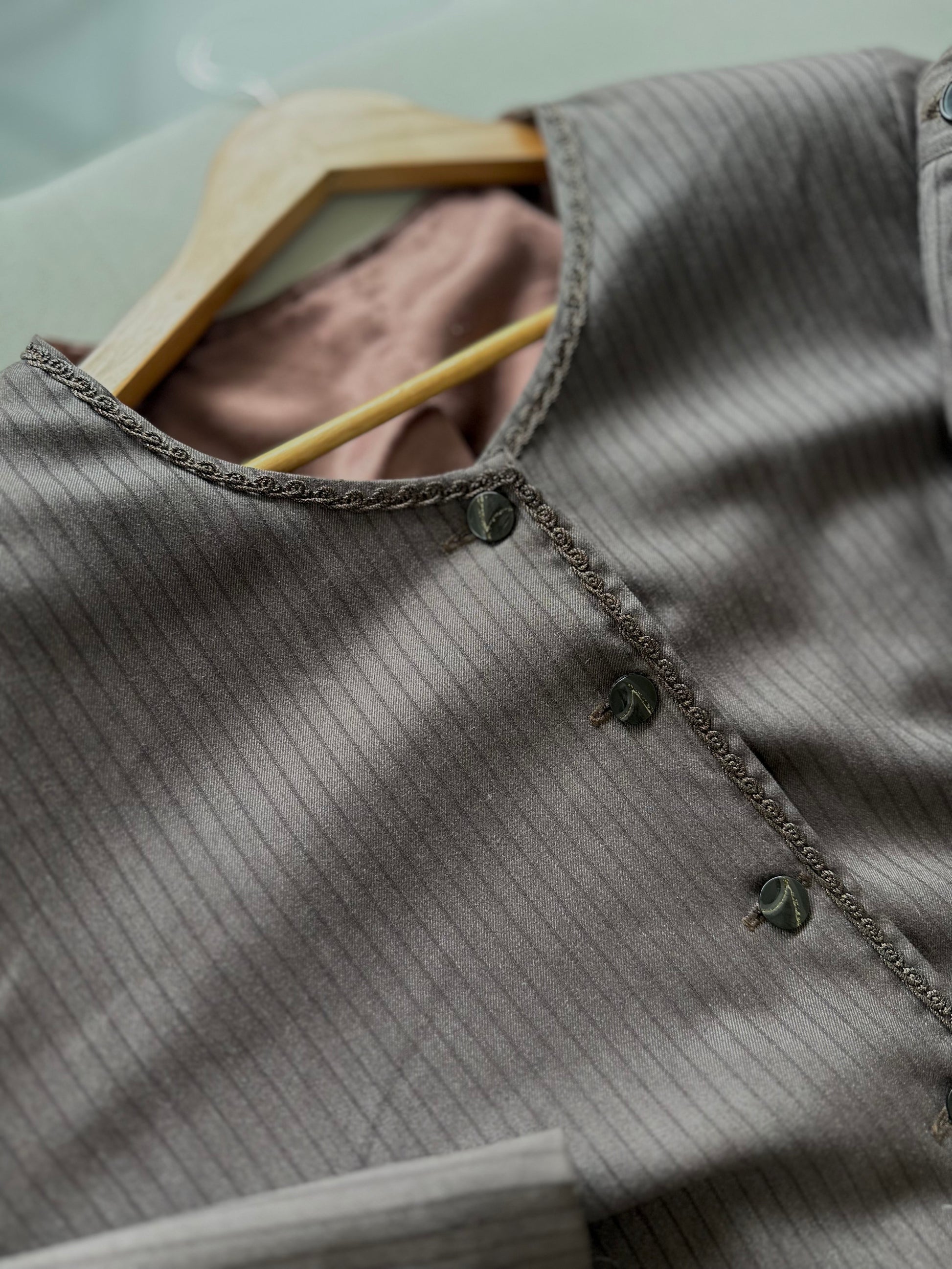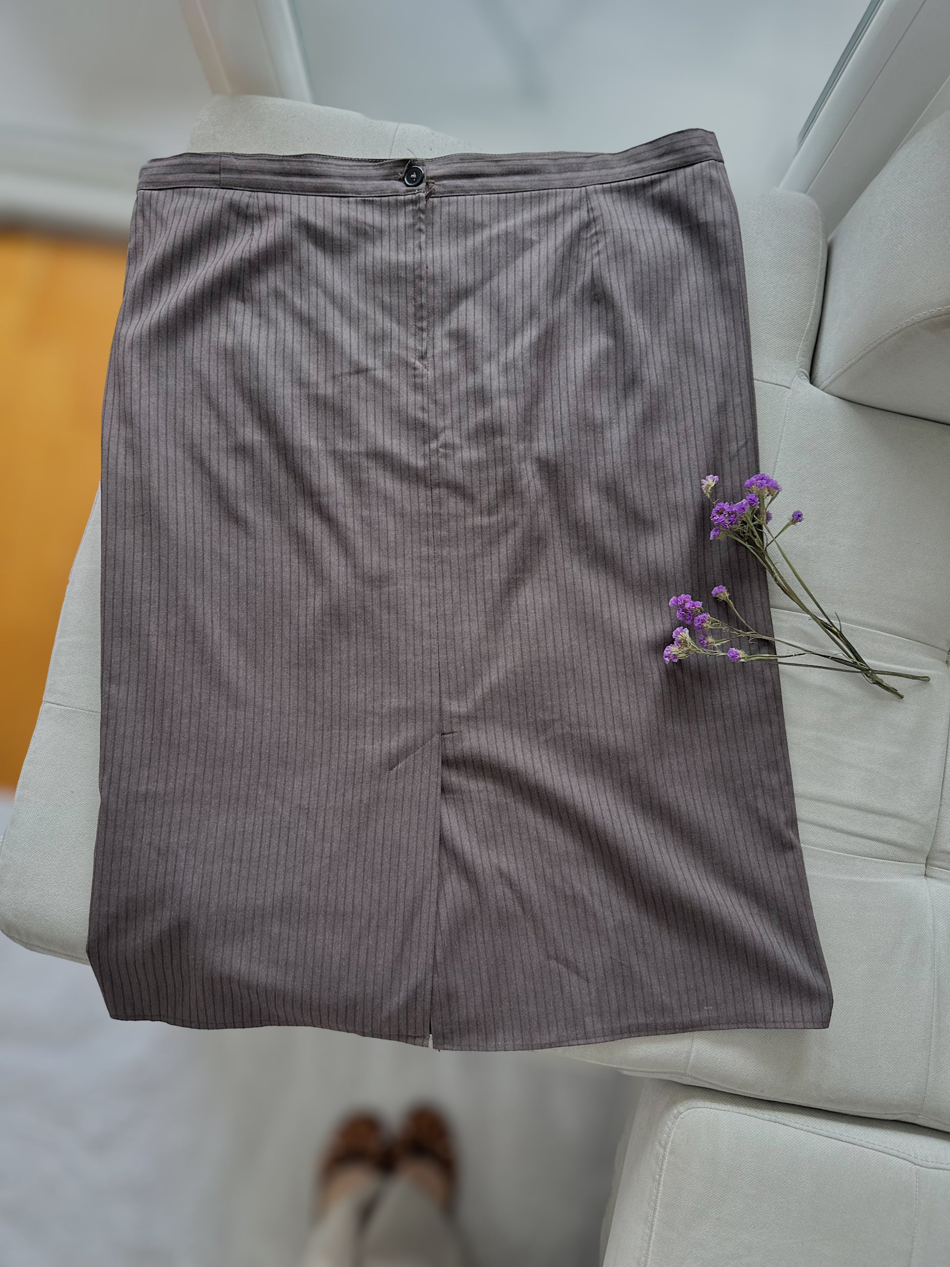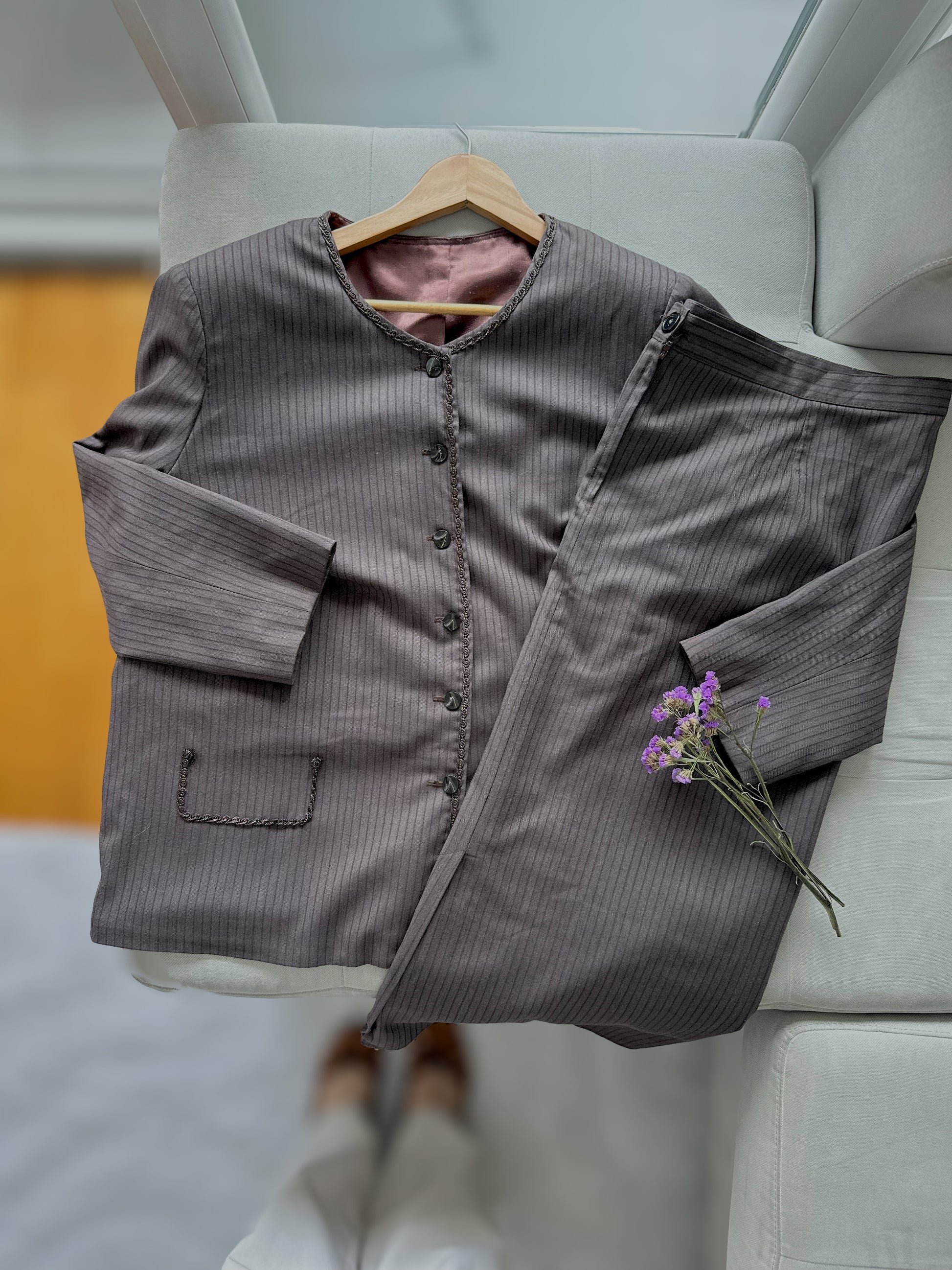 Сет од сако и сукња во кафеаво-сив тон со тенки вертикални линии. Сакото е со округло деколте, украсни копчиња и дискретни везени рабови, а сукњата е права со заден шлиц за удобност.