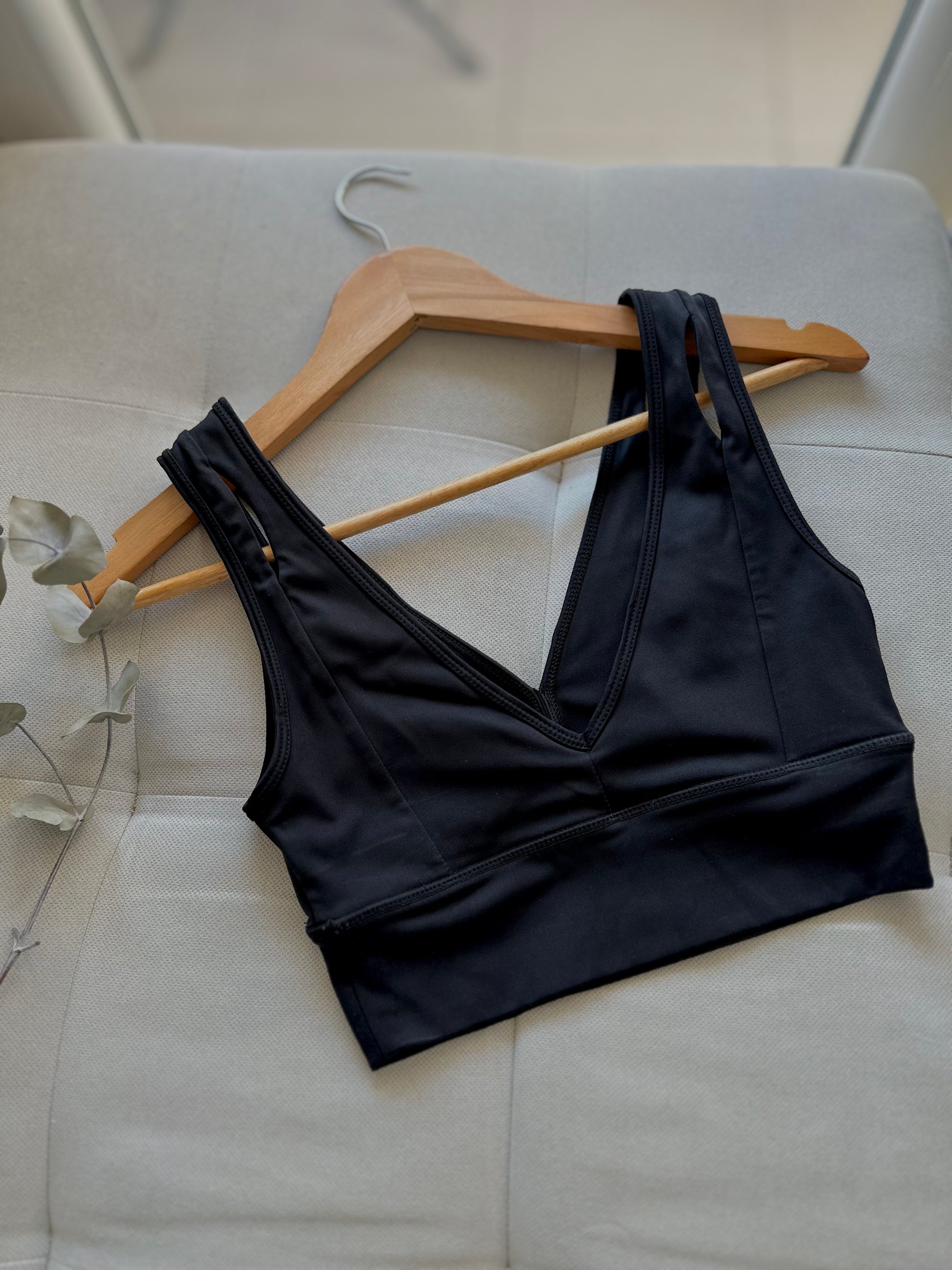Црн спортски топ изработен од мек материјал со еластин.