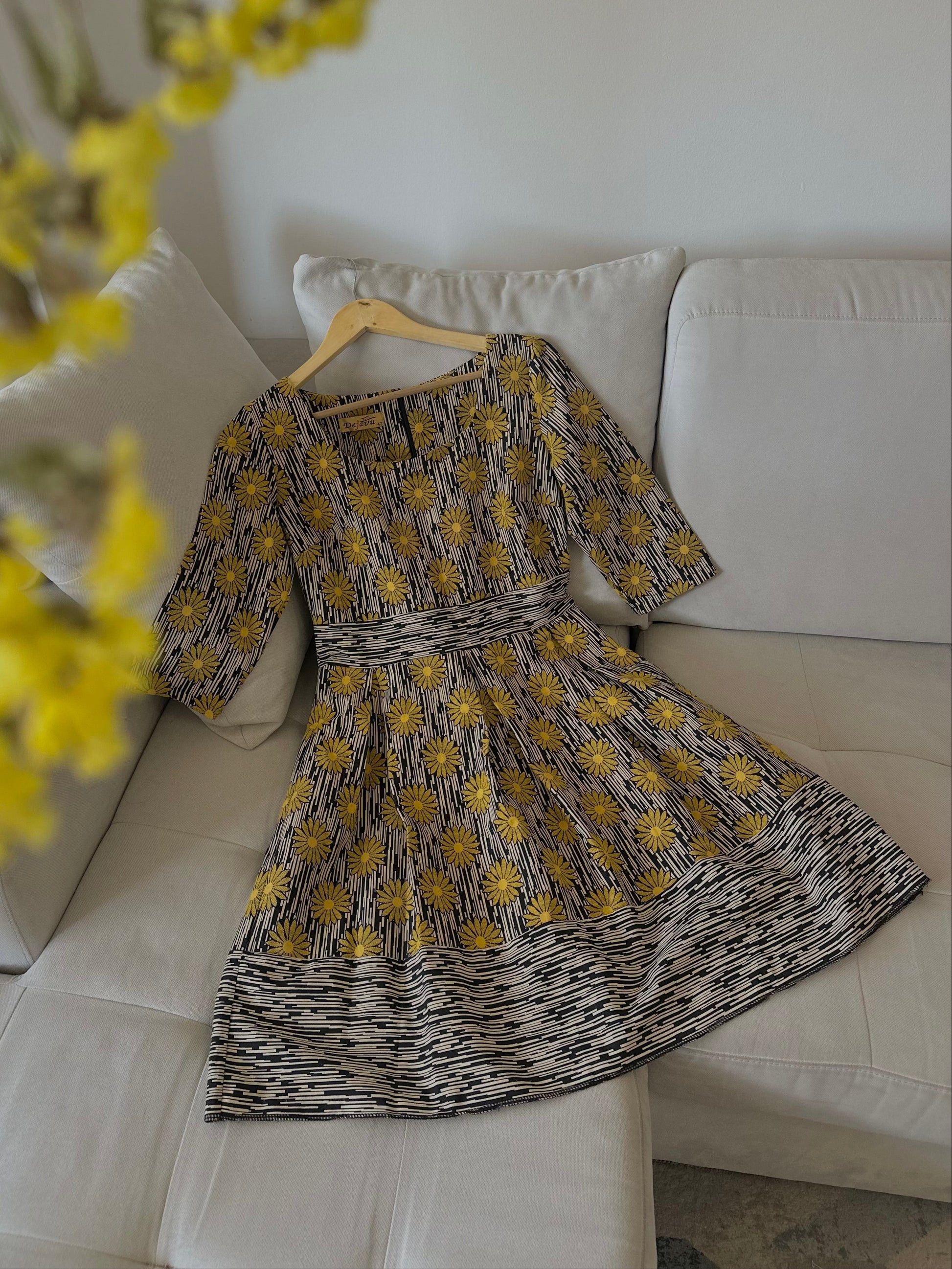 Струкиран модел на фустан со цветен дизајн во жолта, црна и бела комбинација, со 3/4 ракави. Назад е со црн патент за закопчување.