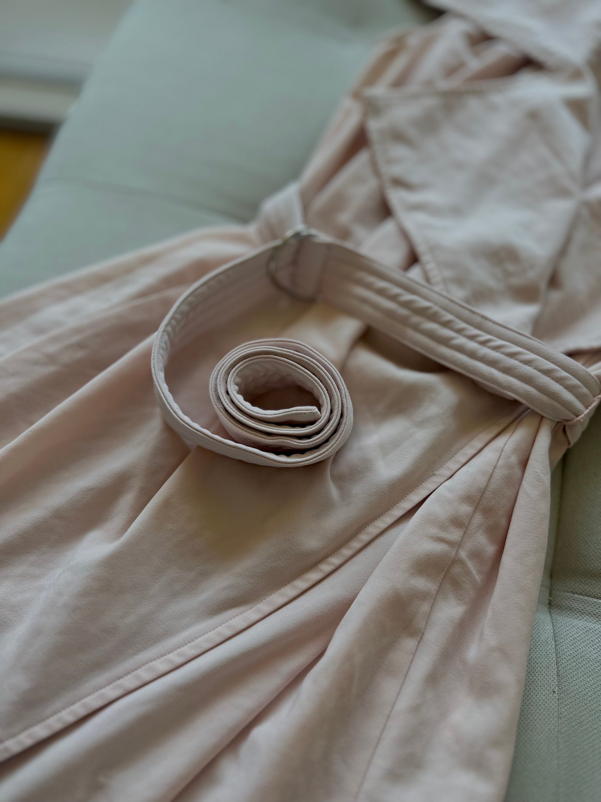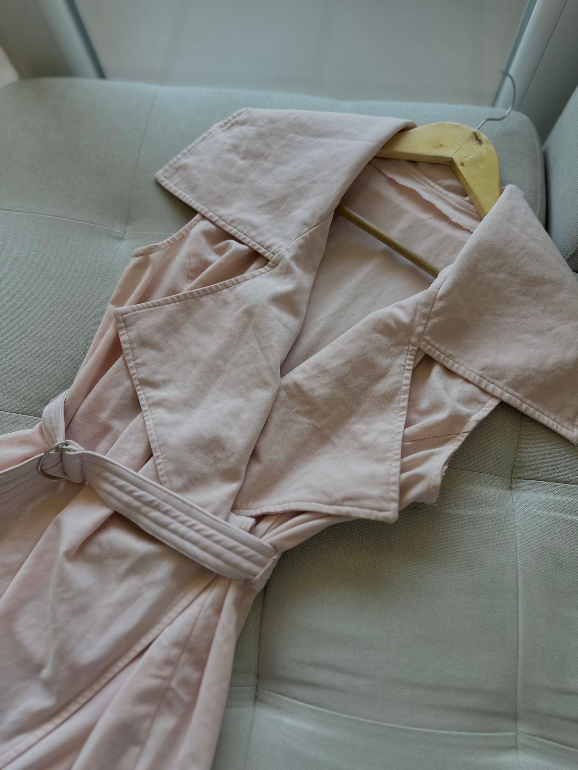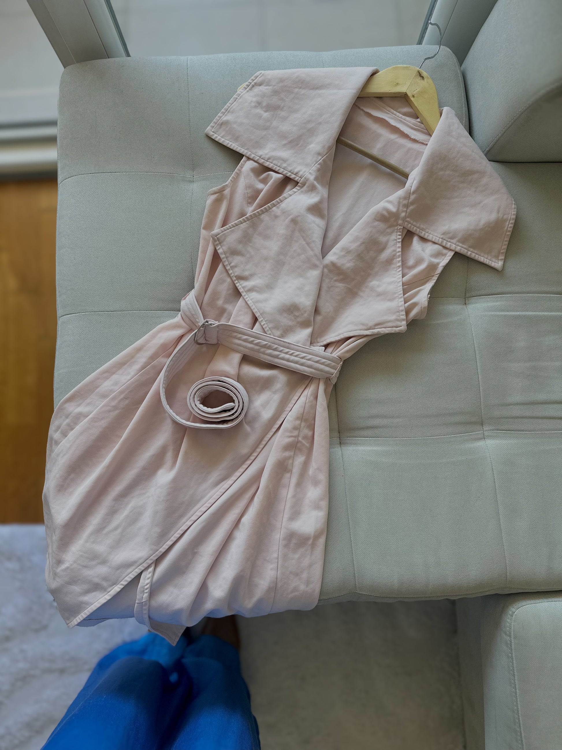 Фустан без ракави, со голема крагна и ремен за врзување околу половината, изработен од лесен материјал.