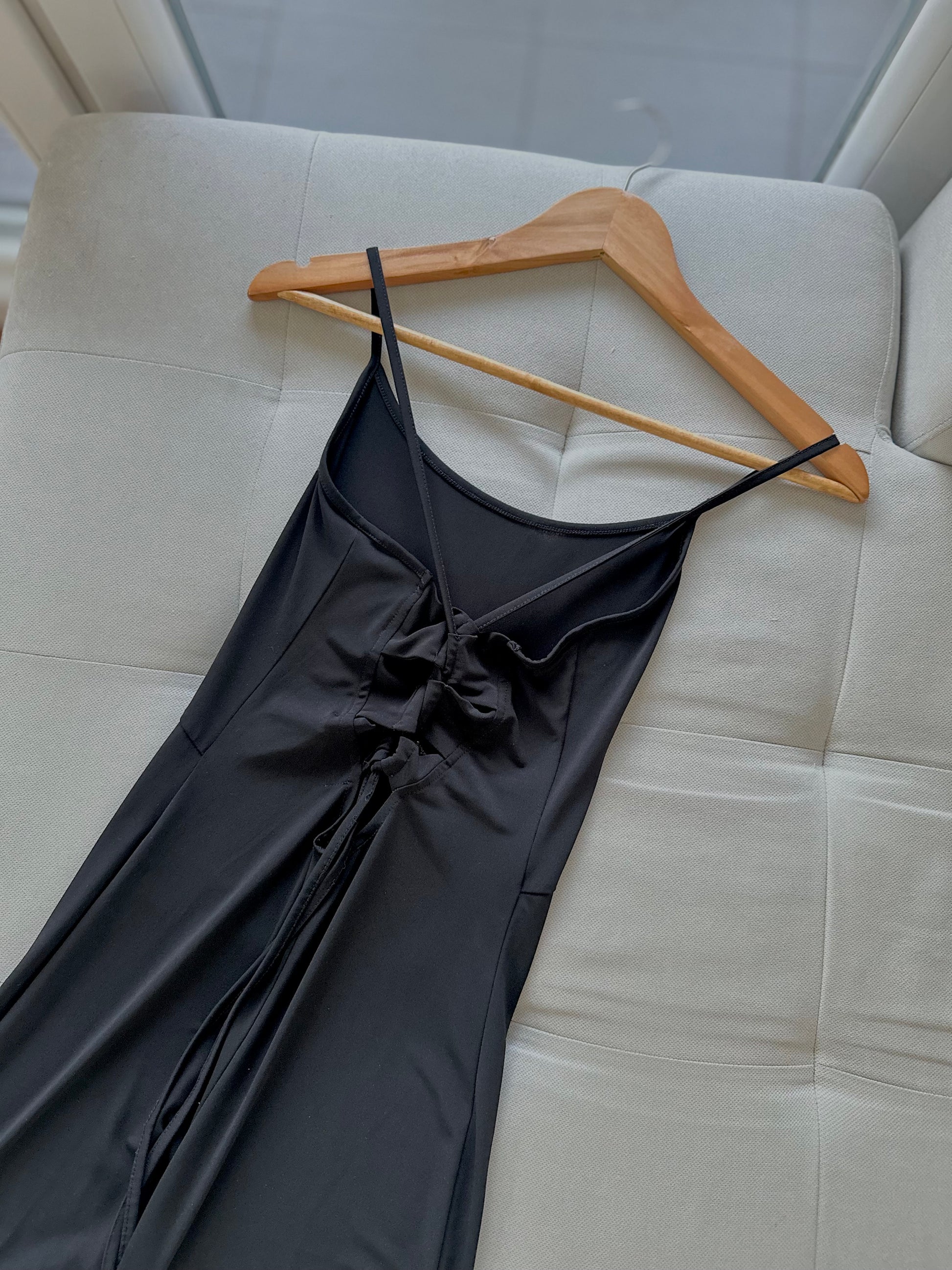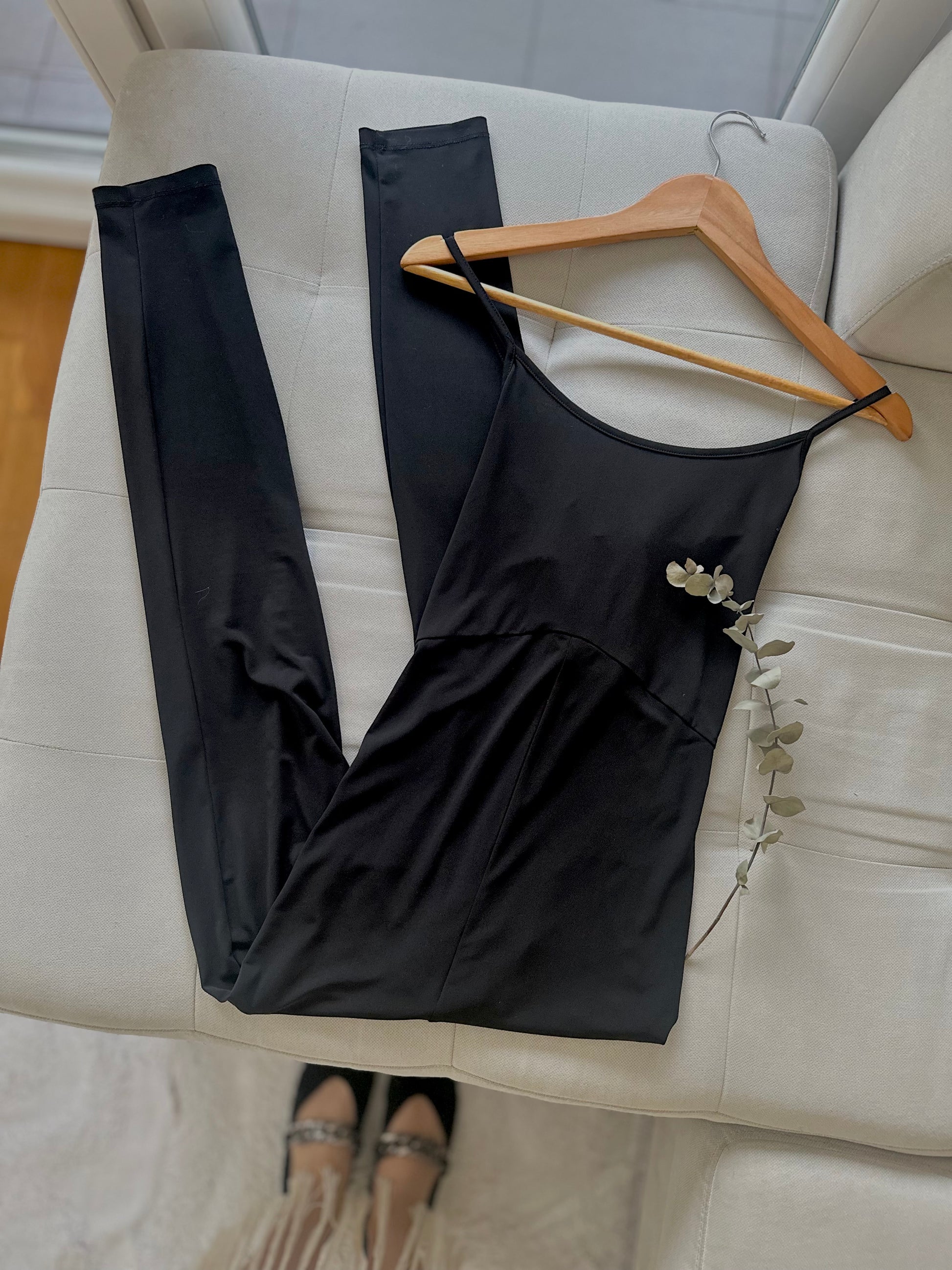 Црн едноделен комбинезон со тенки прерамки. Напред е едноставен и елегантен, а на грбот има декоративно врзување.