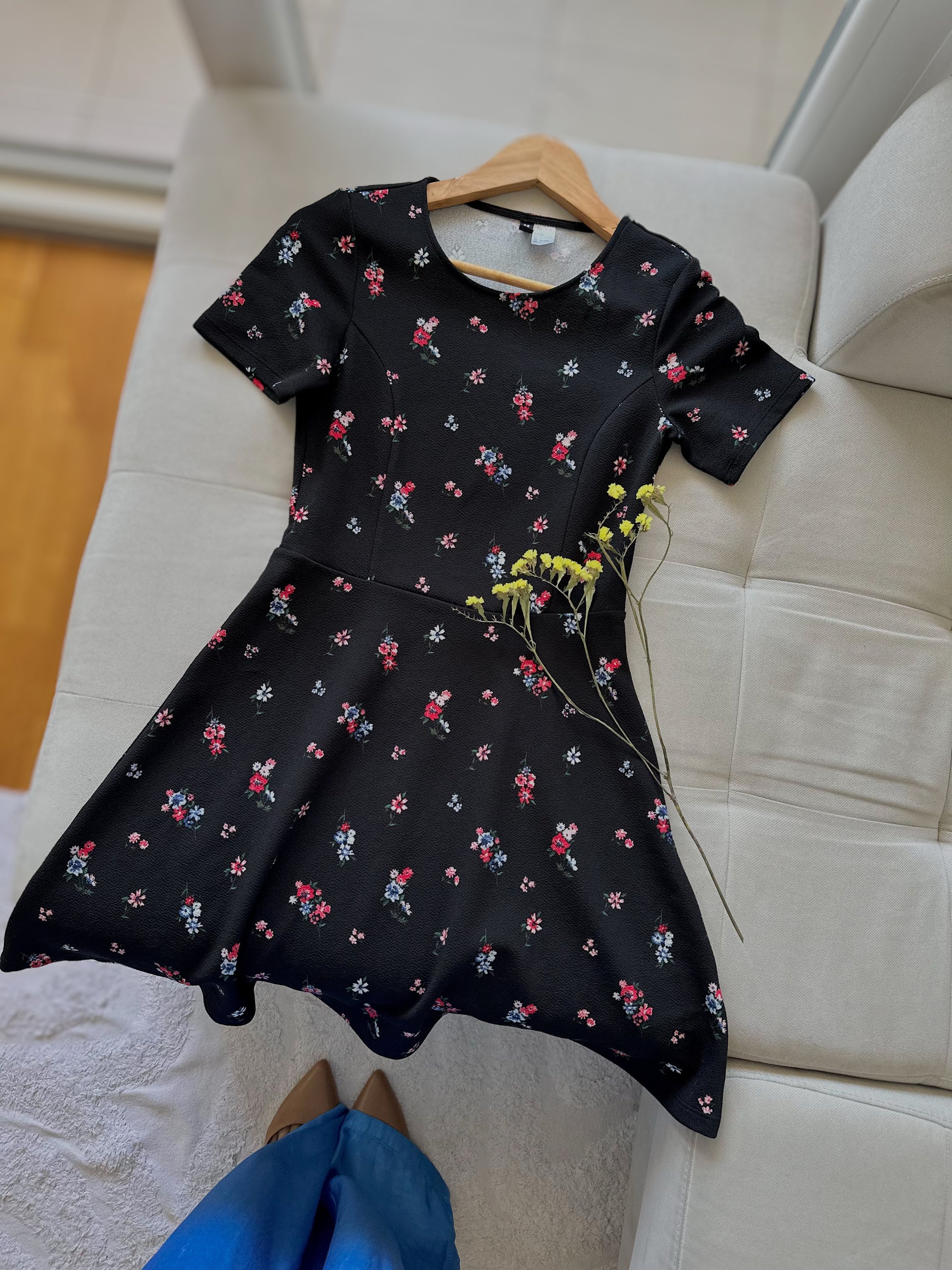 Фустан во црна боја со кратки ракави, изработен од материјал со текстура. Има дезен со мали цветови во црвена, сина и бела боја.