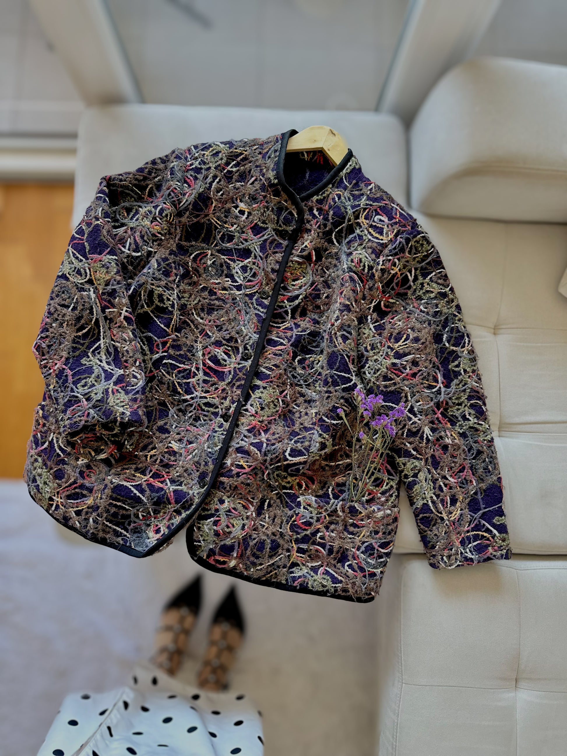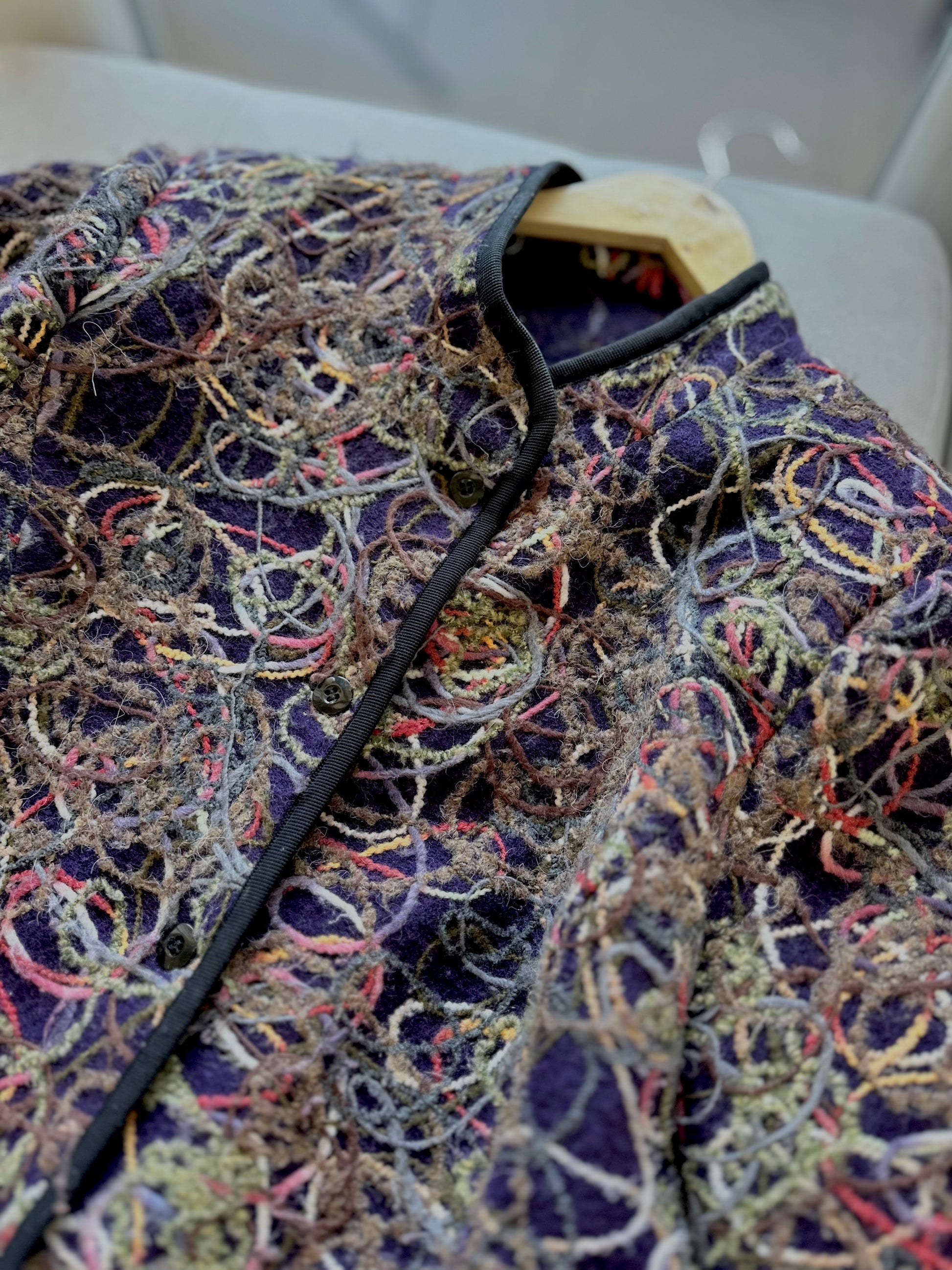 Шарен волнен џемпер со уникатен везен дизајн во повеќе бои на темна основа, со црни копчиња и рабови.