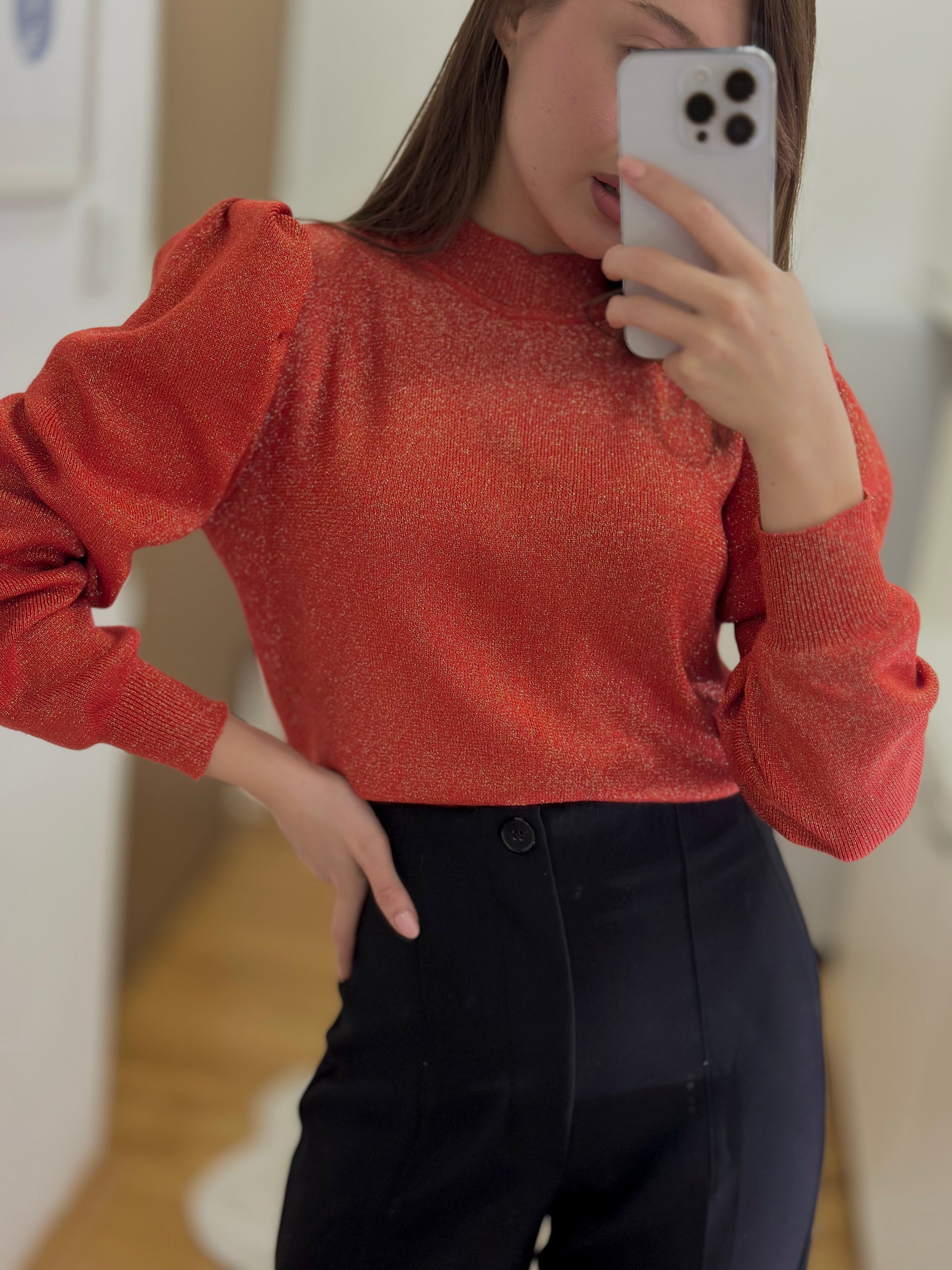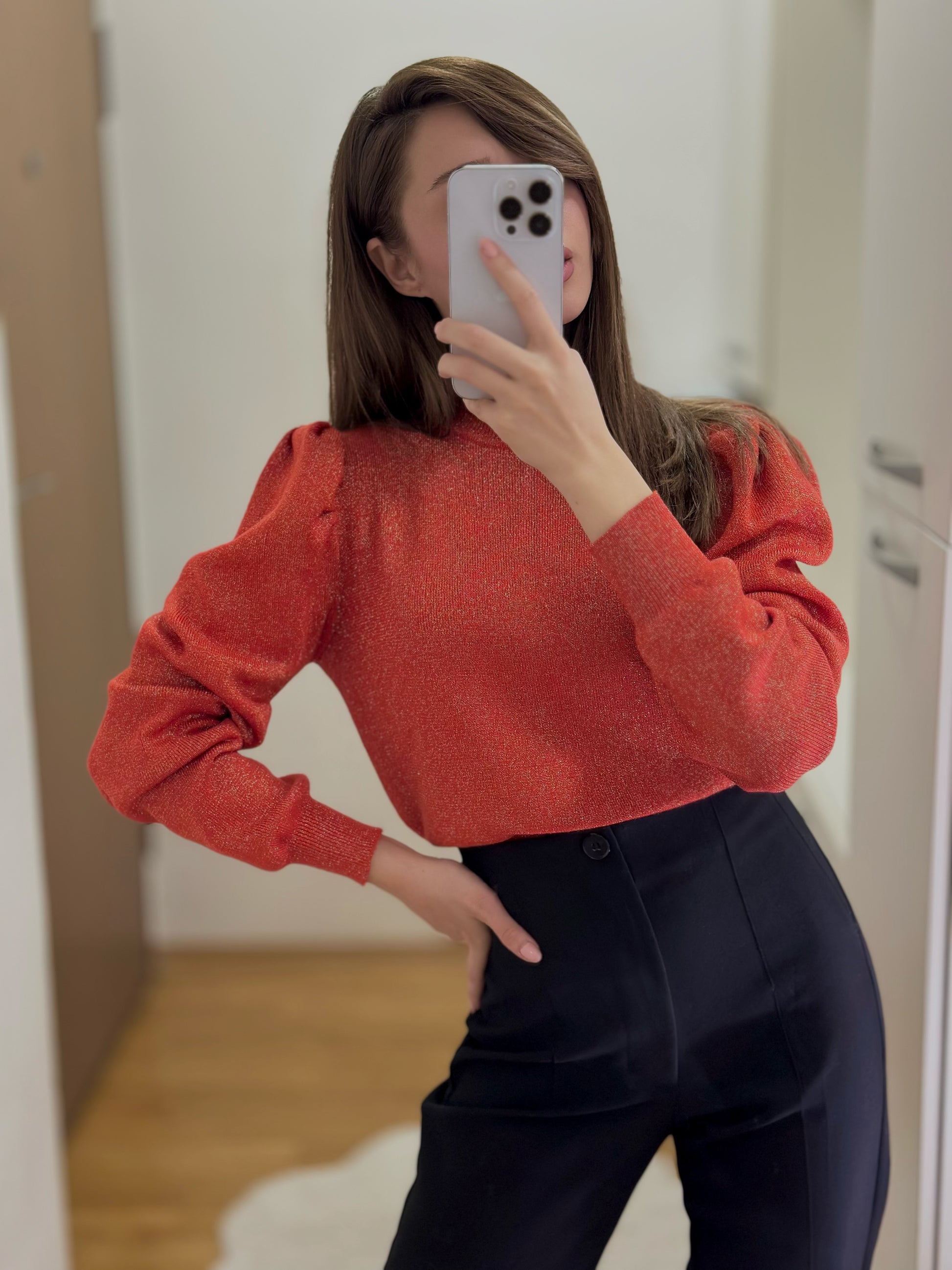 Блуза со долги ракави и нагласени раменици, во светло портокалова боја со сјајни детали.