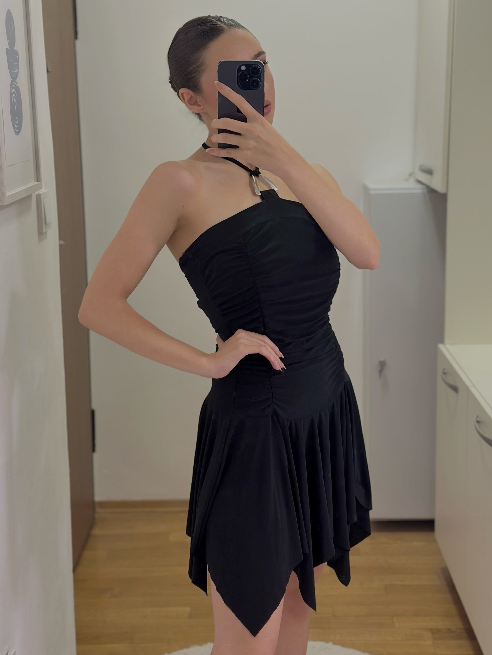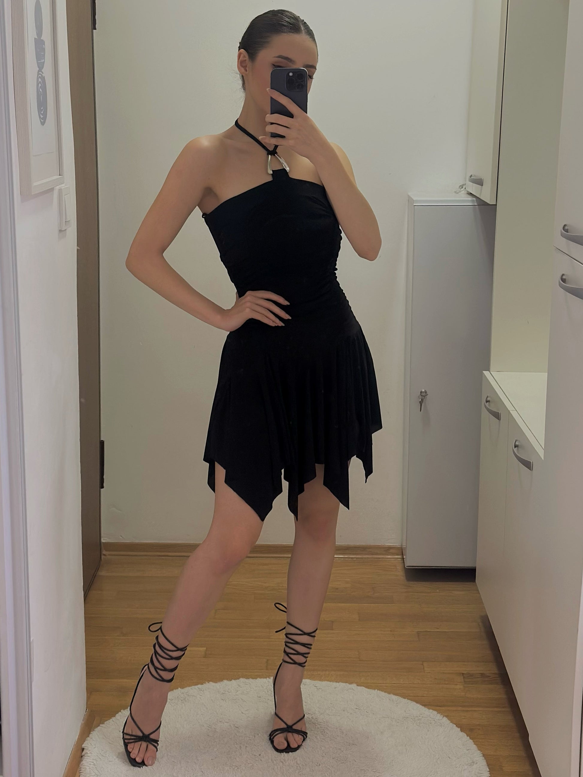 Коктел фустан во црна боја со асиметрична линија и отворени рамена.