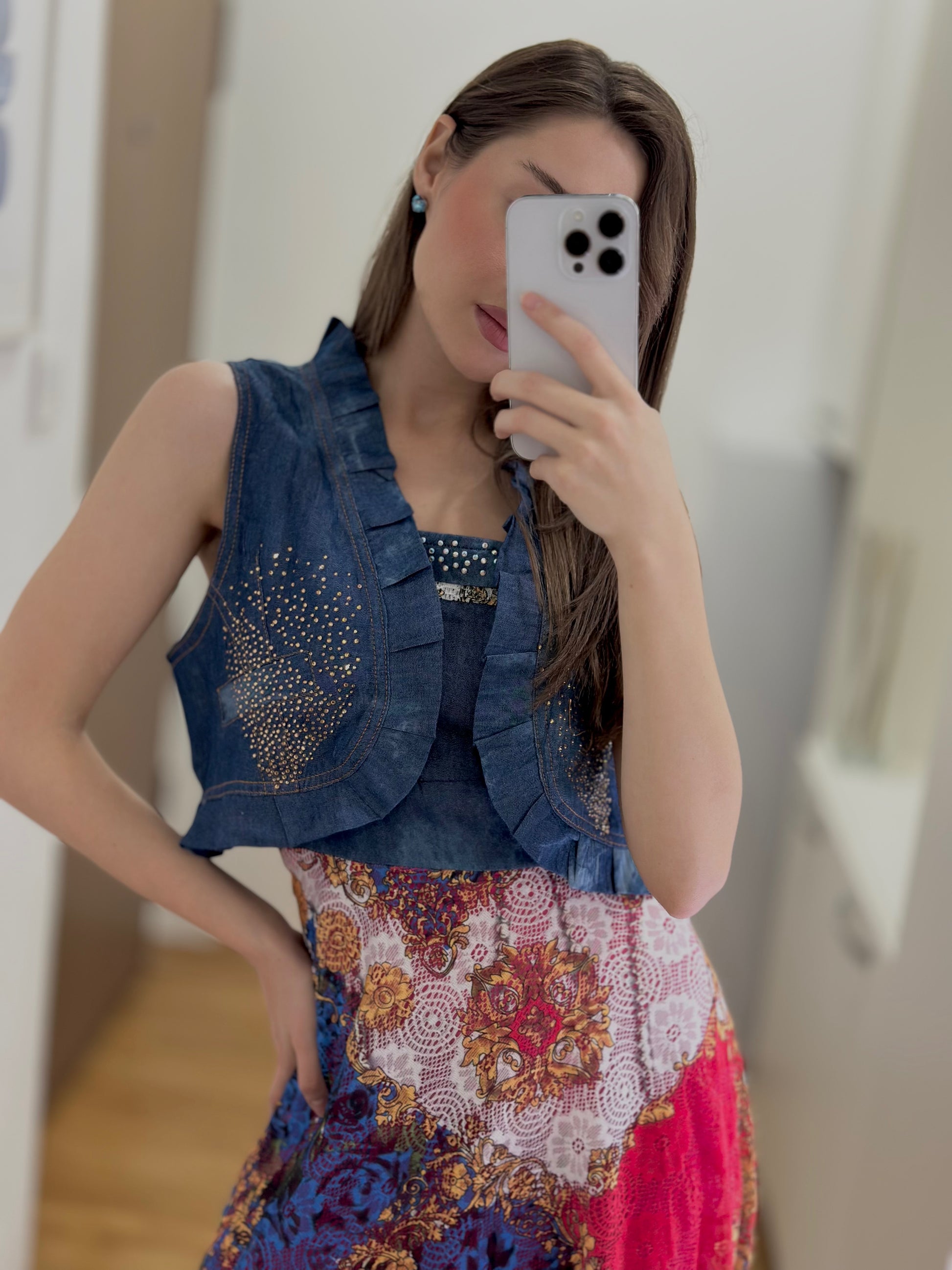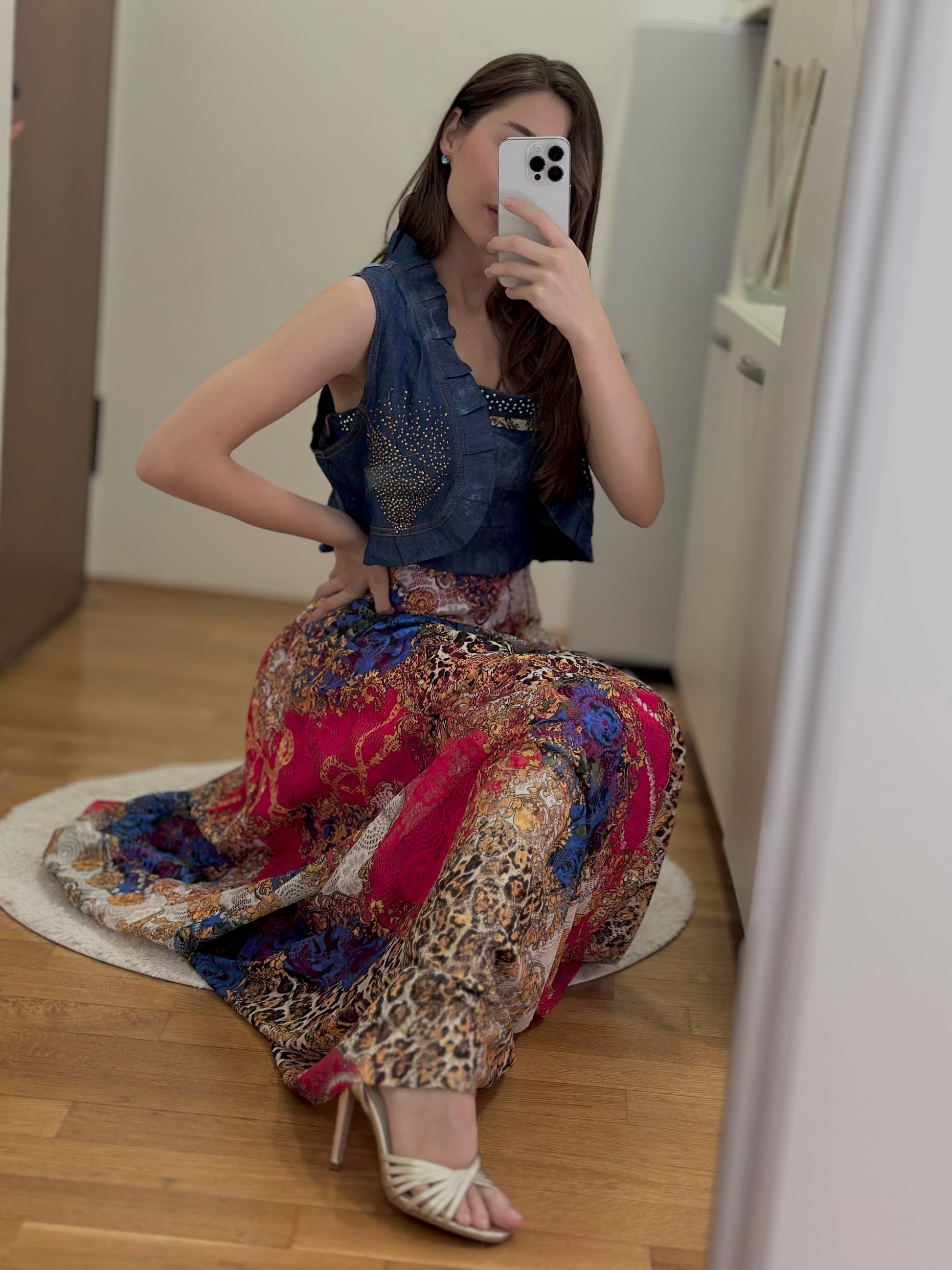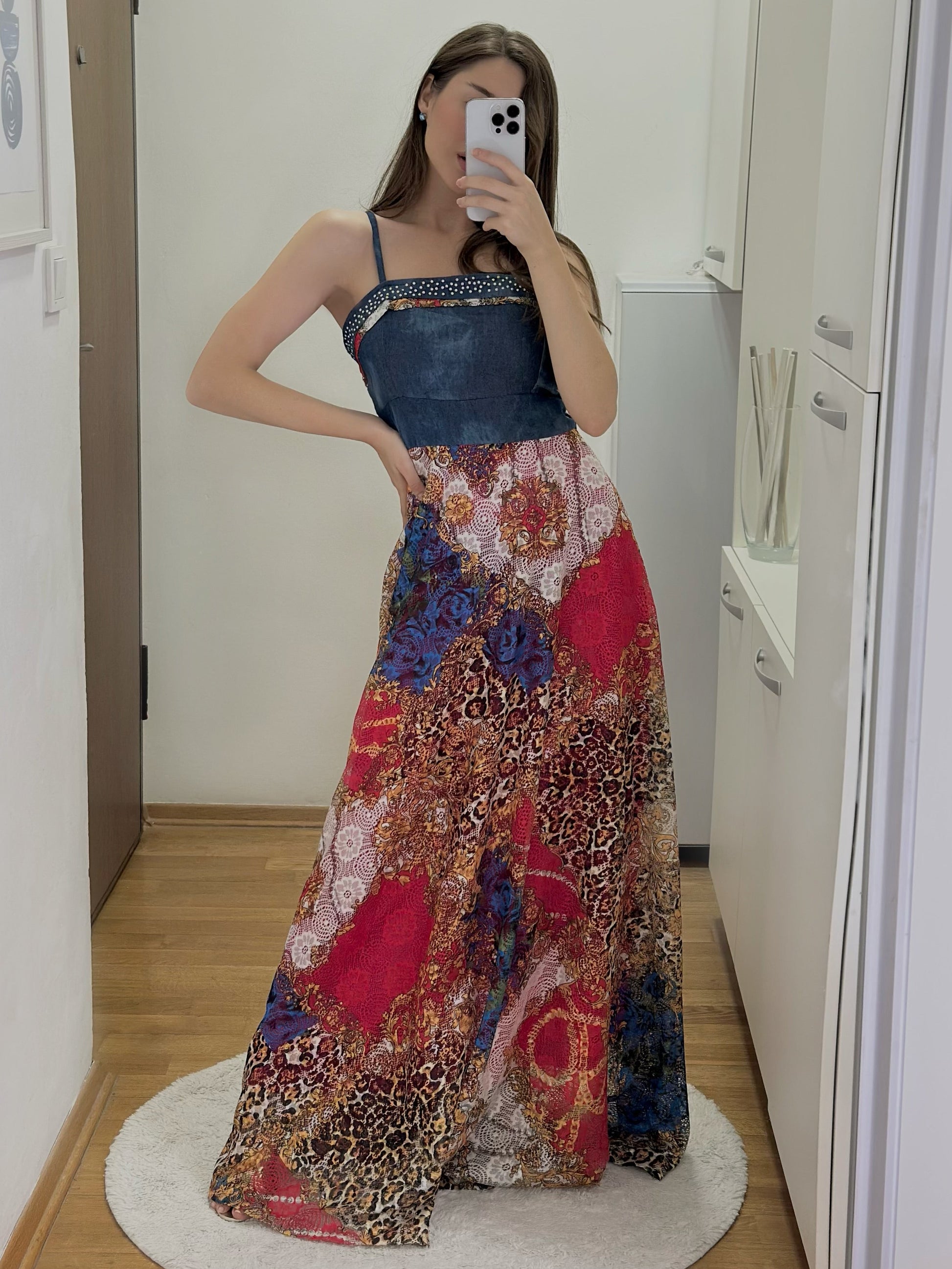 Макси фустан со впечатлив микс од дезени, горниот дел е изработен од тексас материјал, а долниот дел е со живописен принт во рузова, сина и животинска шара. Моделот има тенки прерамки и може да се комбинира со кус елек кој е во комплет со фустанот.