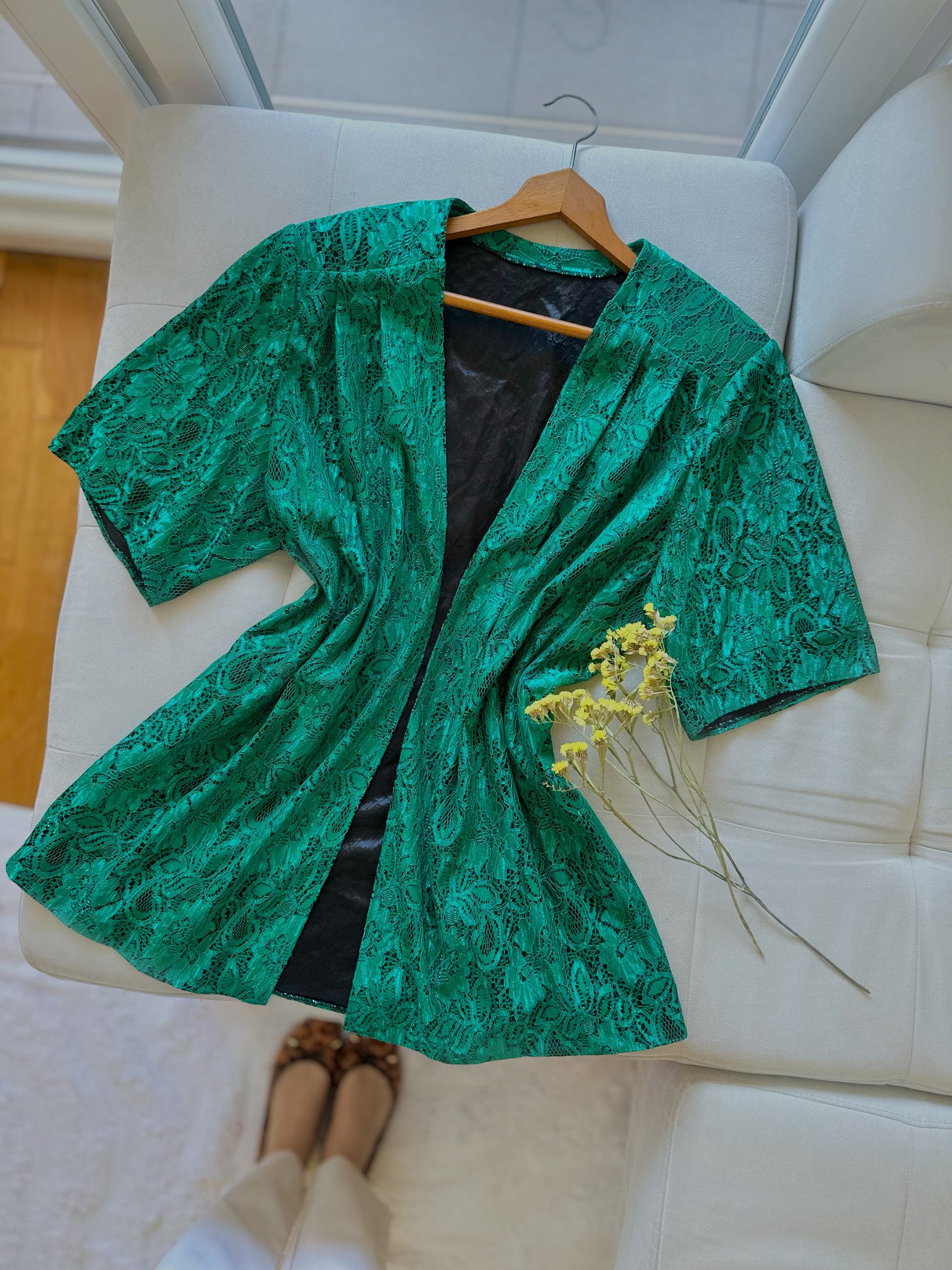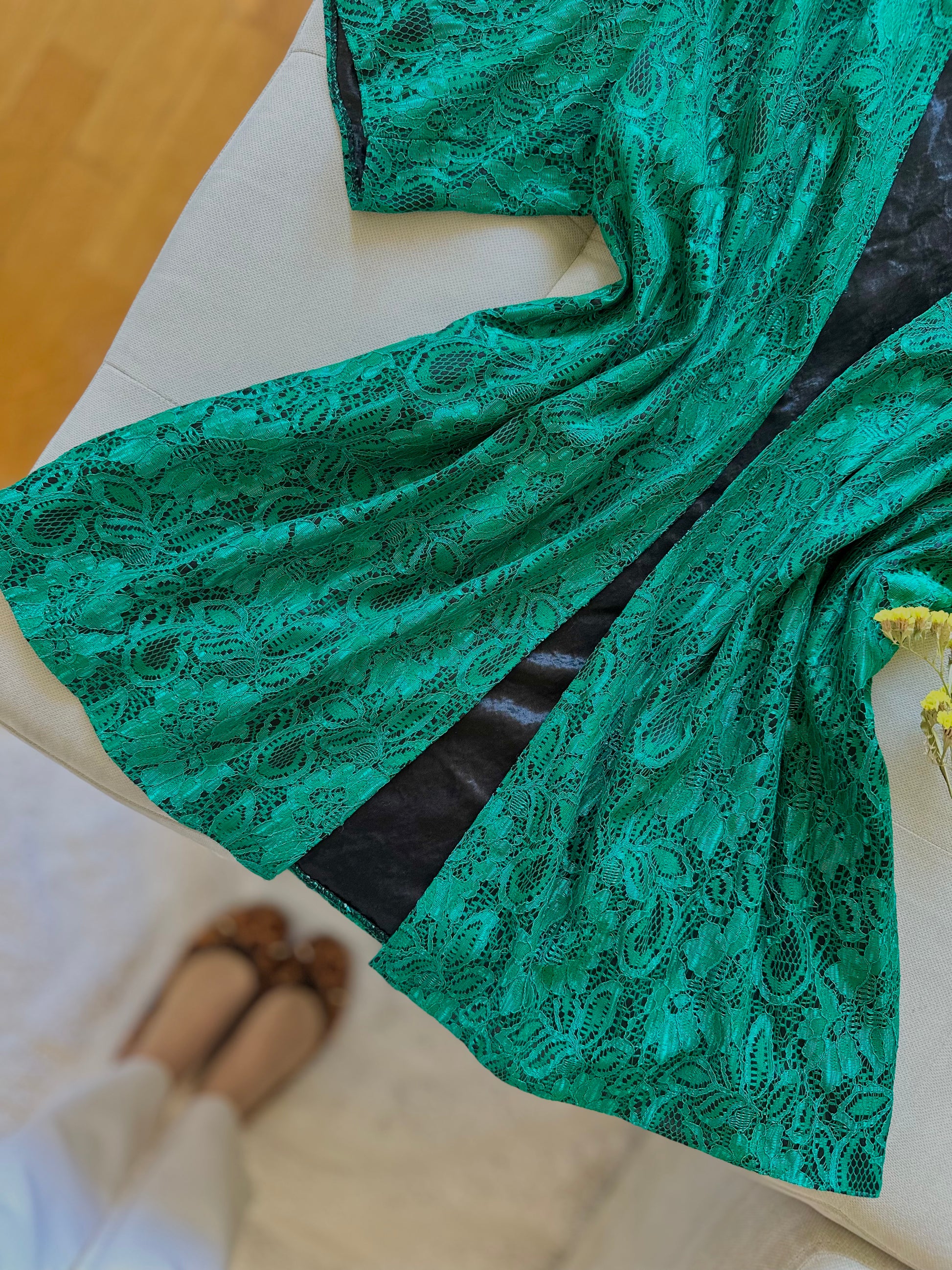 Елегантна наметка со зелена чипка на црна подлога, збогатена со потпунки на рамениците.