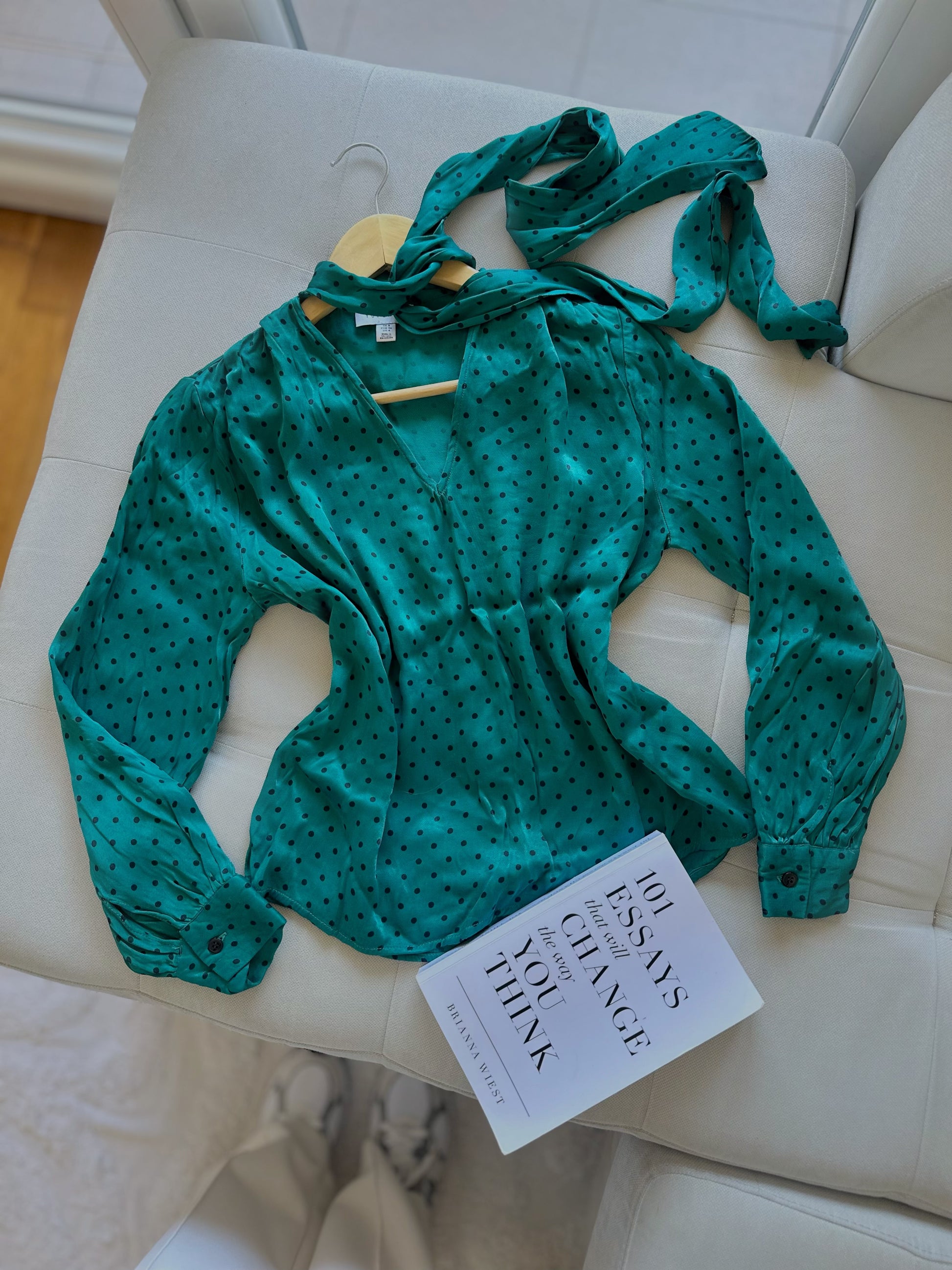 Елегантна, зеленкаста кошула со точкаст принт на врзување околу вратот
