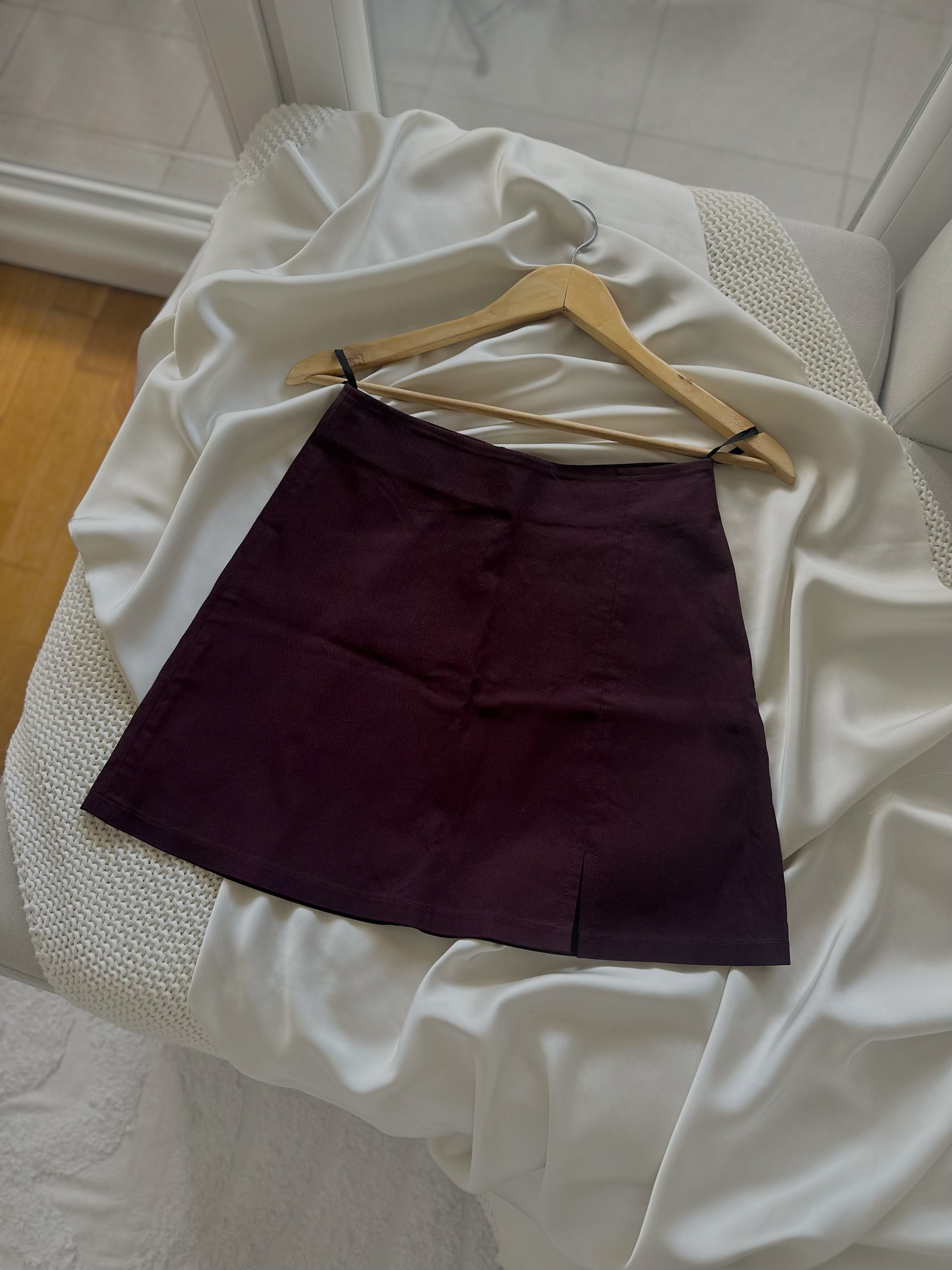Сукња во црвенкасто-розева нијанса, со мал шлиц и со растеглив материјал